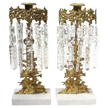 Pair of French Gilt Metal and Crystal Girandole Candelabra with Bird Motif