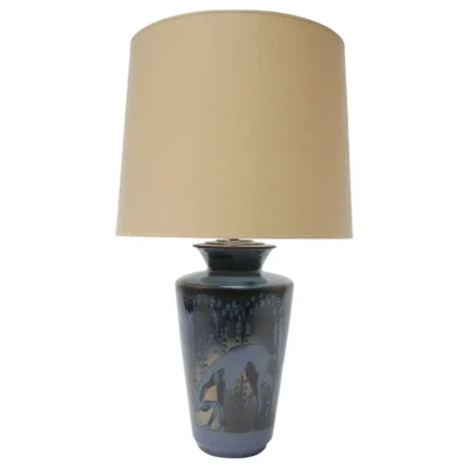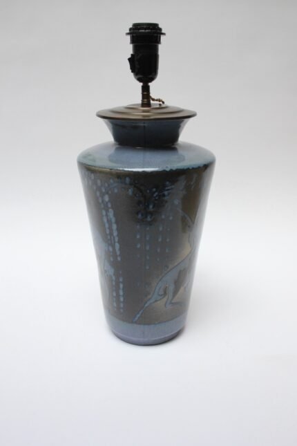 French Deco Ceramic Blue Glaze”Deer in Landscape” Lamp by Atelier Primavera