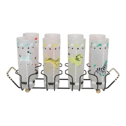 Set of Eight Vintage Frosted Glasses With Animal Carousel Motif by Libbey With Carrier