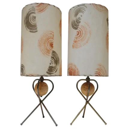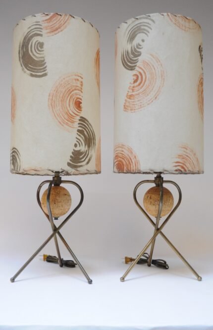 Pair of Modernera Cork and Brass Tripod Table Lamps with Fiberglass Shades