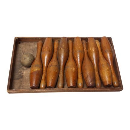 Antique Painted Wooden Skittles / Bowling Pins With Balls and Box