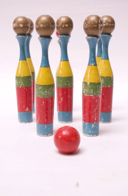 Set of Eight Mid-Century Modern English Skittles With Ball