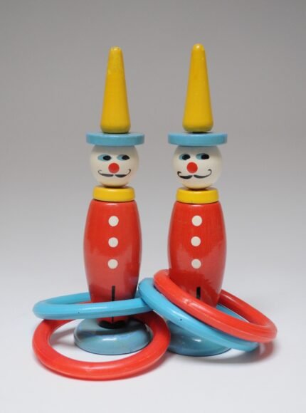Pair of Vintage French Painted Wooden “Clown” Skittles / Ring Toss Stands with Rings