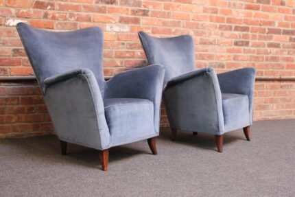 Pair of Mid-Century Italian Modern Blue Velvet Sculptural Wingback Lounge Chairs