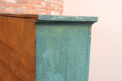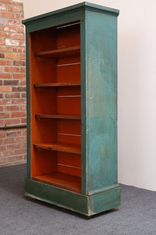 American folk art bookcase retaining its original teal and orange paint (ca. 1920, USA).