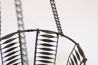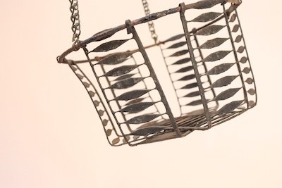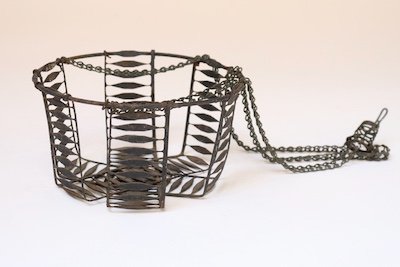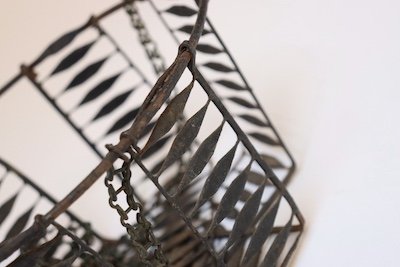 Rustic metal wire egg basket with original hook and chain (ca. 19th Century, USA).