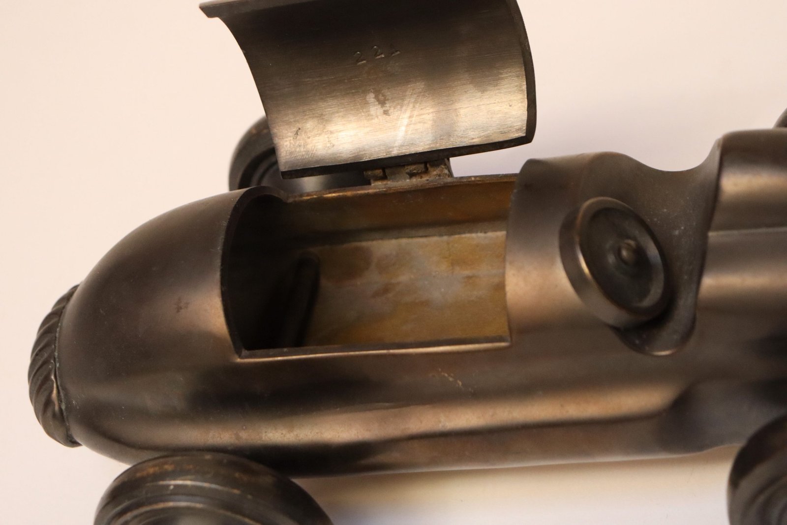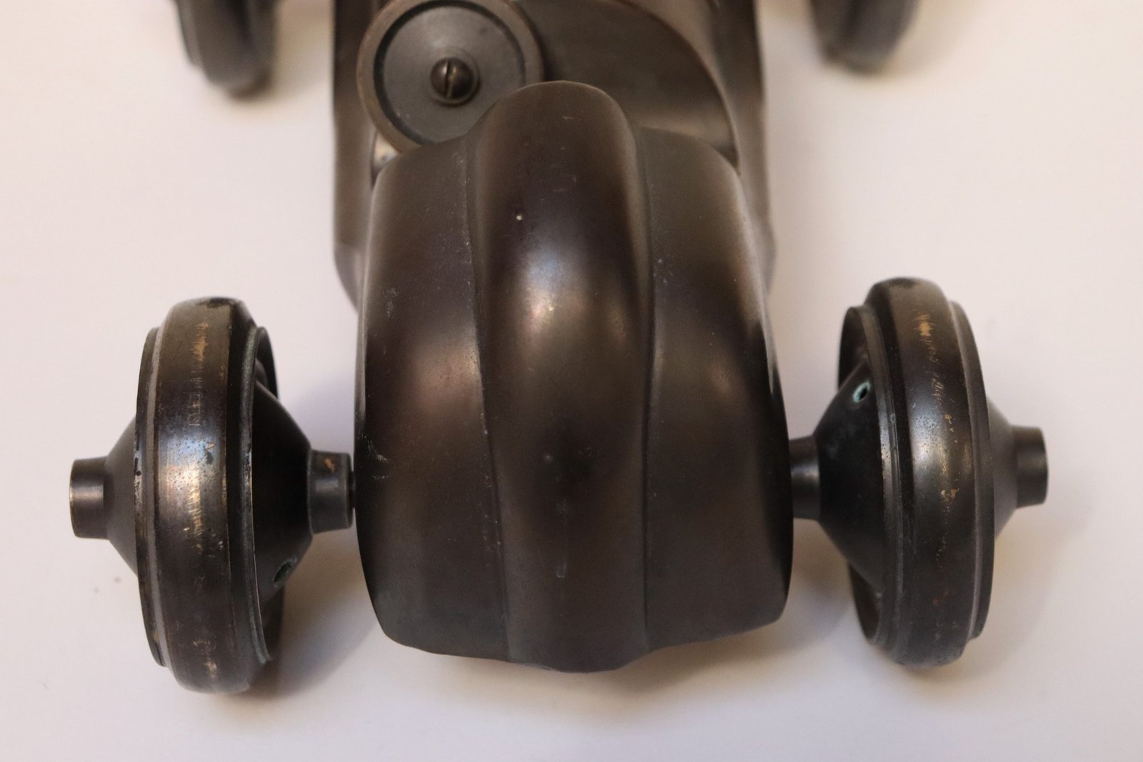 Art Deco cast bronze race car/roadster figurine resembling the speedcar popularized by the 1935 Monopoly game piece (ca. 1930s, USA).