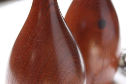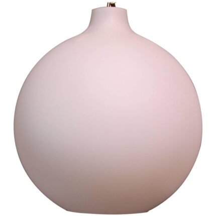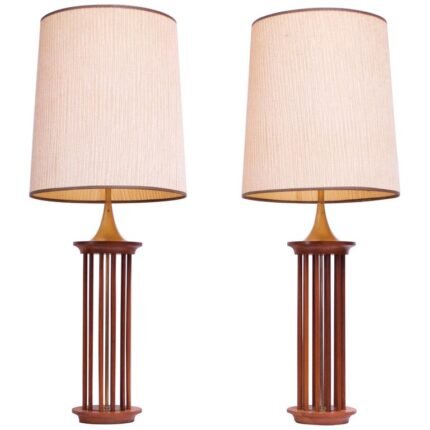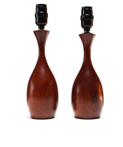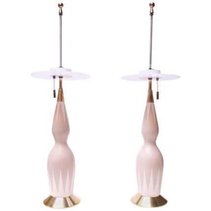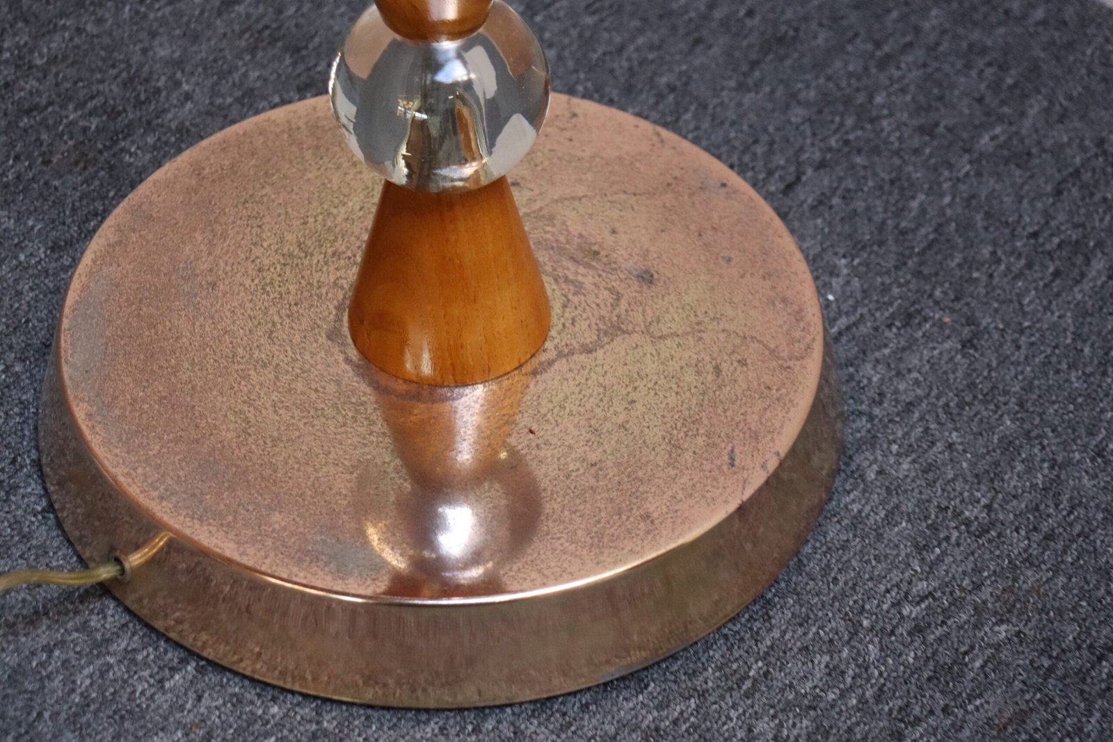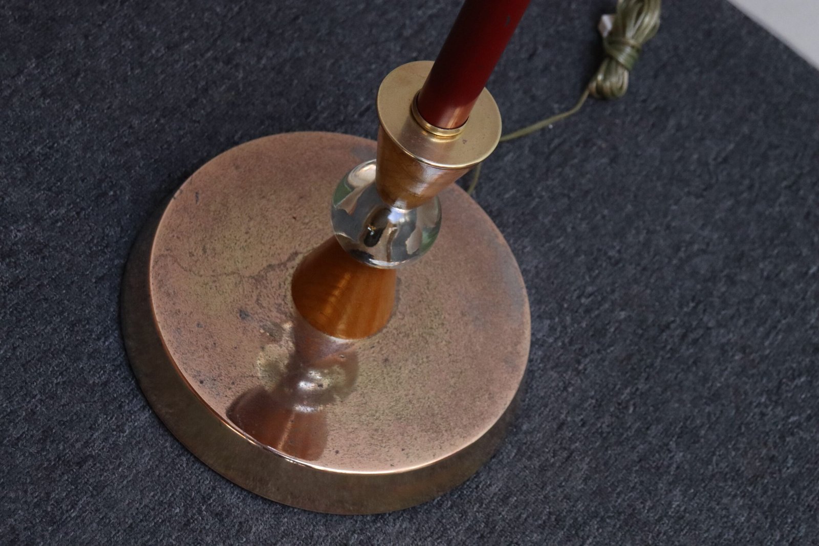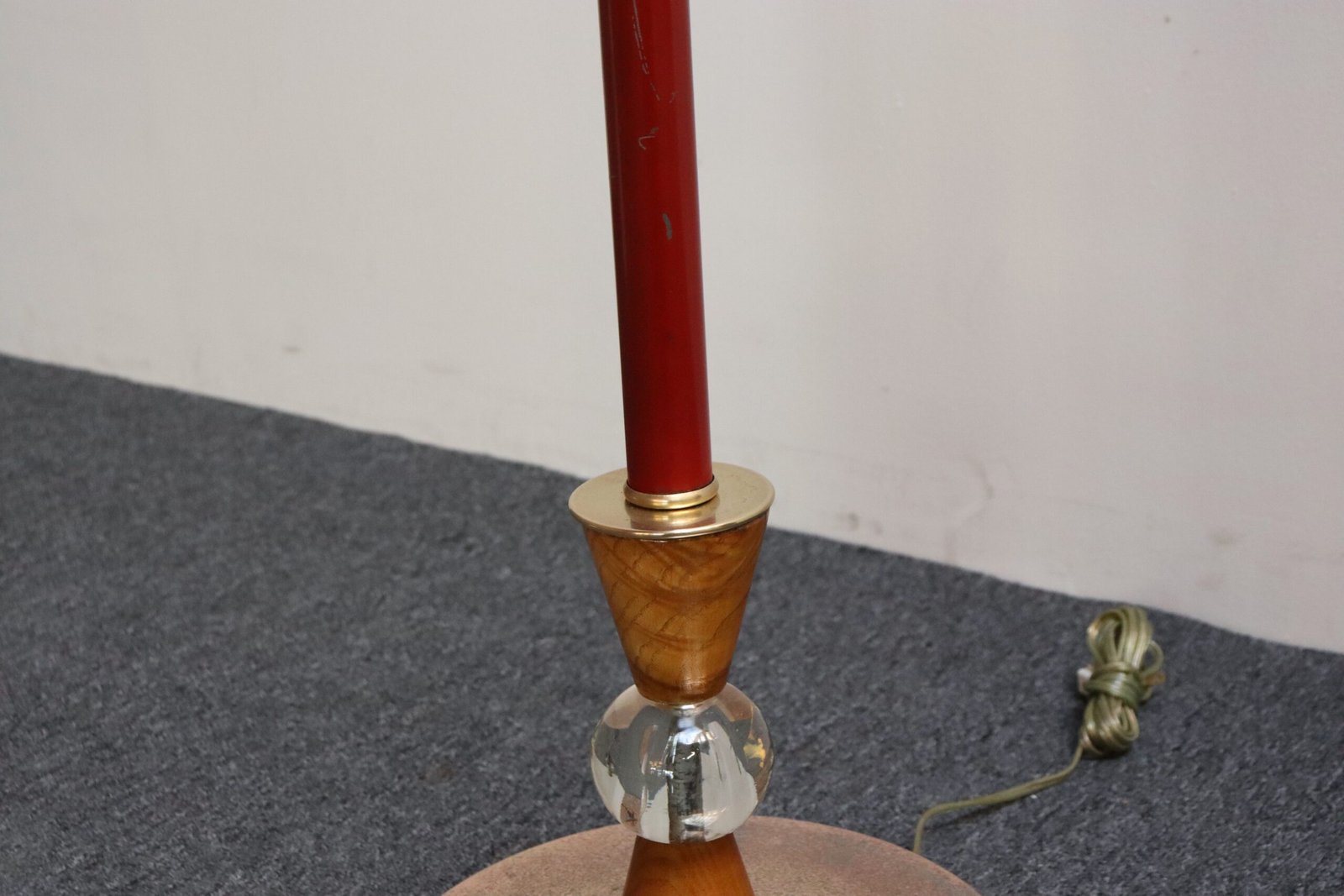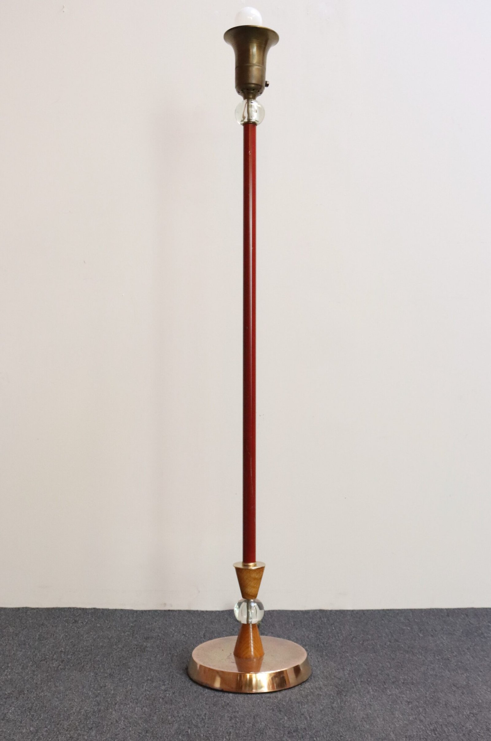 Composed of a slender red painted metal stem supported by a round rose-hued brass base embellished with dual elm wood conical mounts divided by a glass orb. A second glass orb at the top serves as the collar for the patinated brass shade.