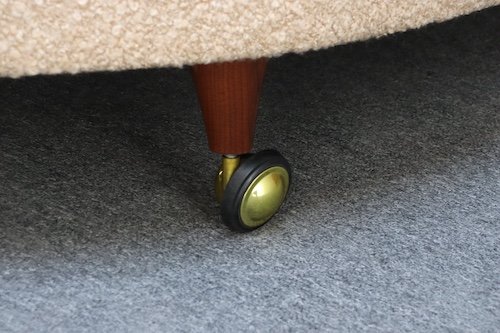 The teak legs have been refinished, and the brass casters are new old stock (1970s, but identical to the original, worn casters).