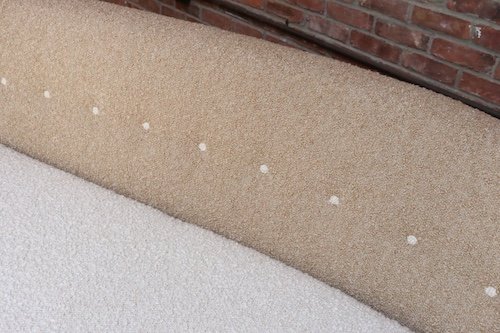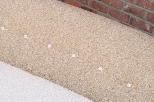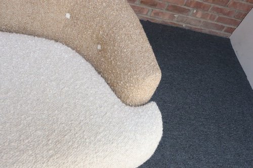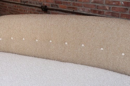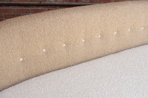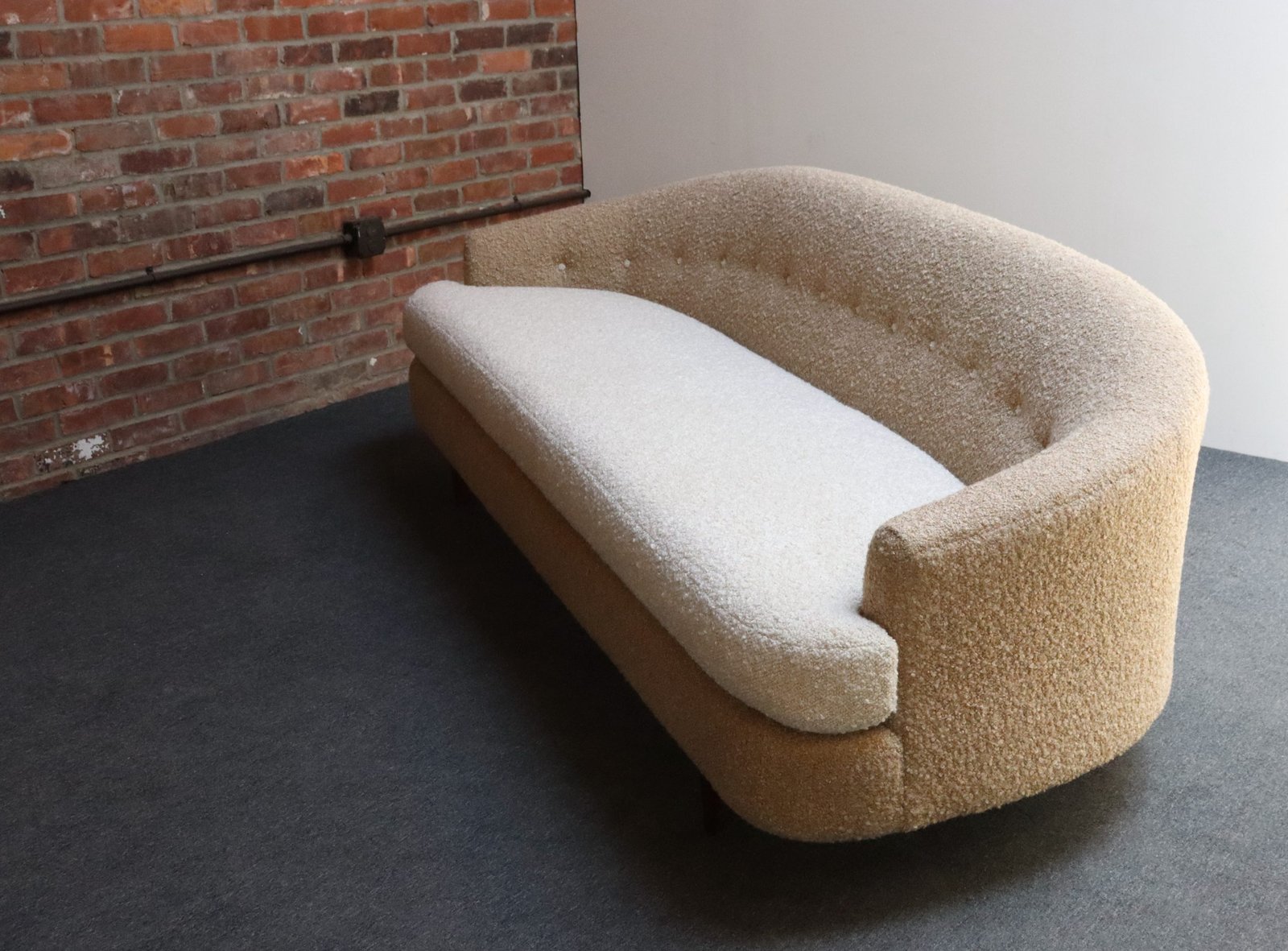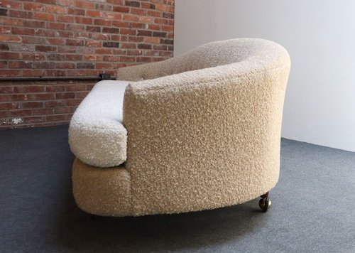 The bouclé is new: the shell is a tawny/gold-brown bouclé (Kravet 36114-166) and the cushion/buttons are an oatmeal Kravet bouclé (36114-106).