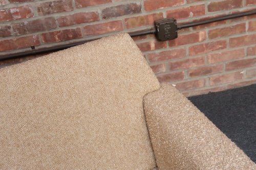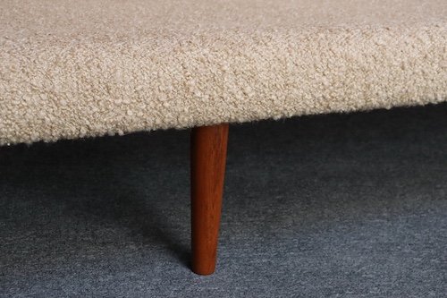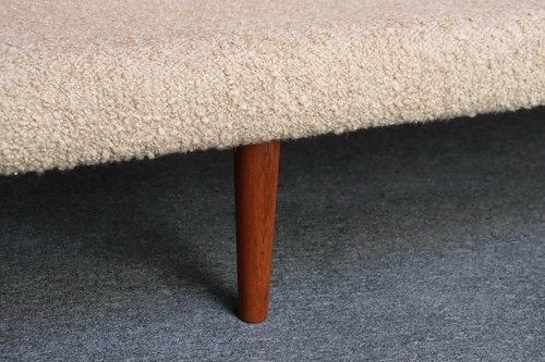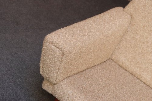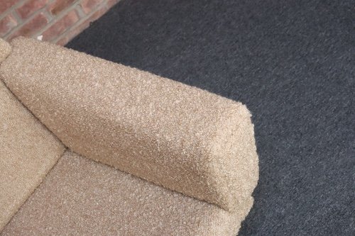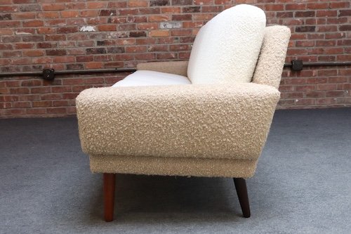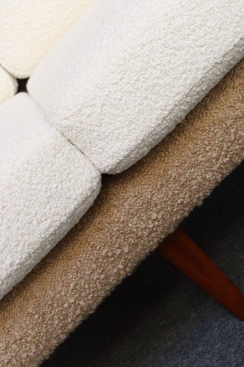 The teak legs have been refinished, and the bouclé is new: the shell is a tawny/gold-brown bouclé (Kravet 36114-166) and the cushions are a white/cream Kravet bouclé (36120-1).