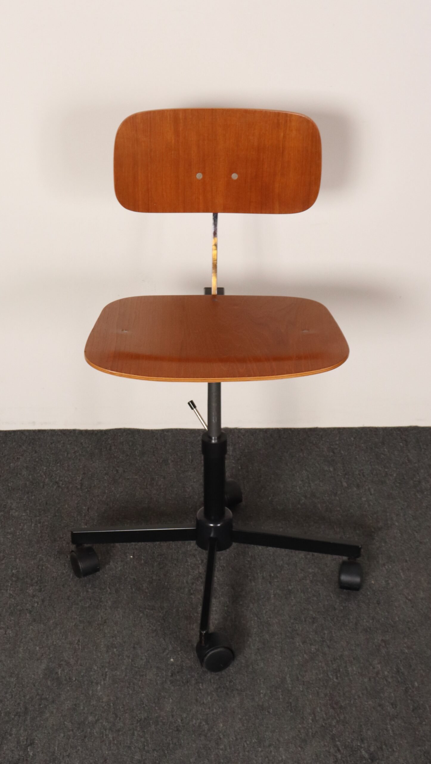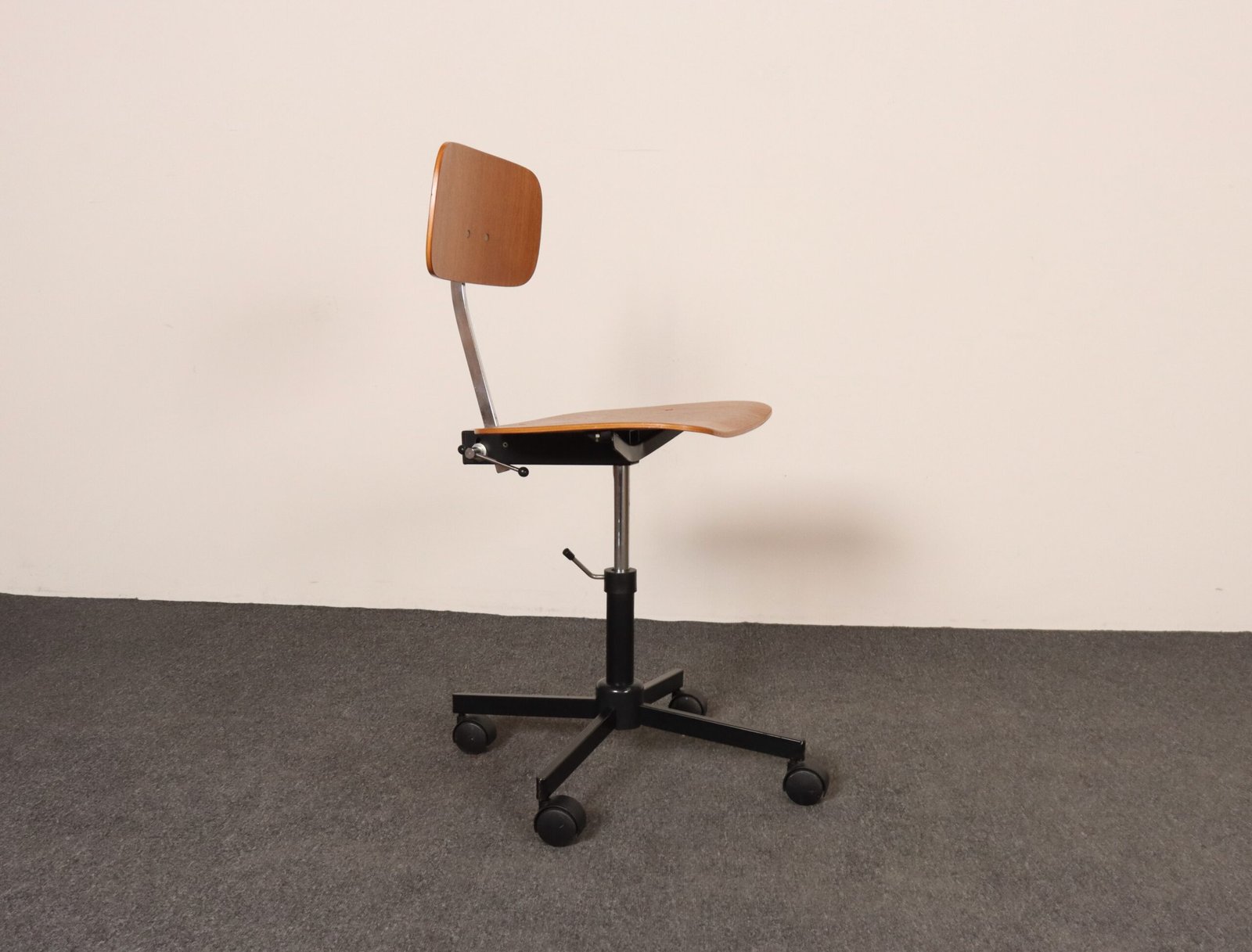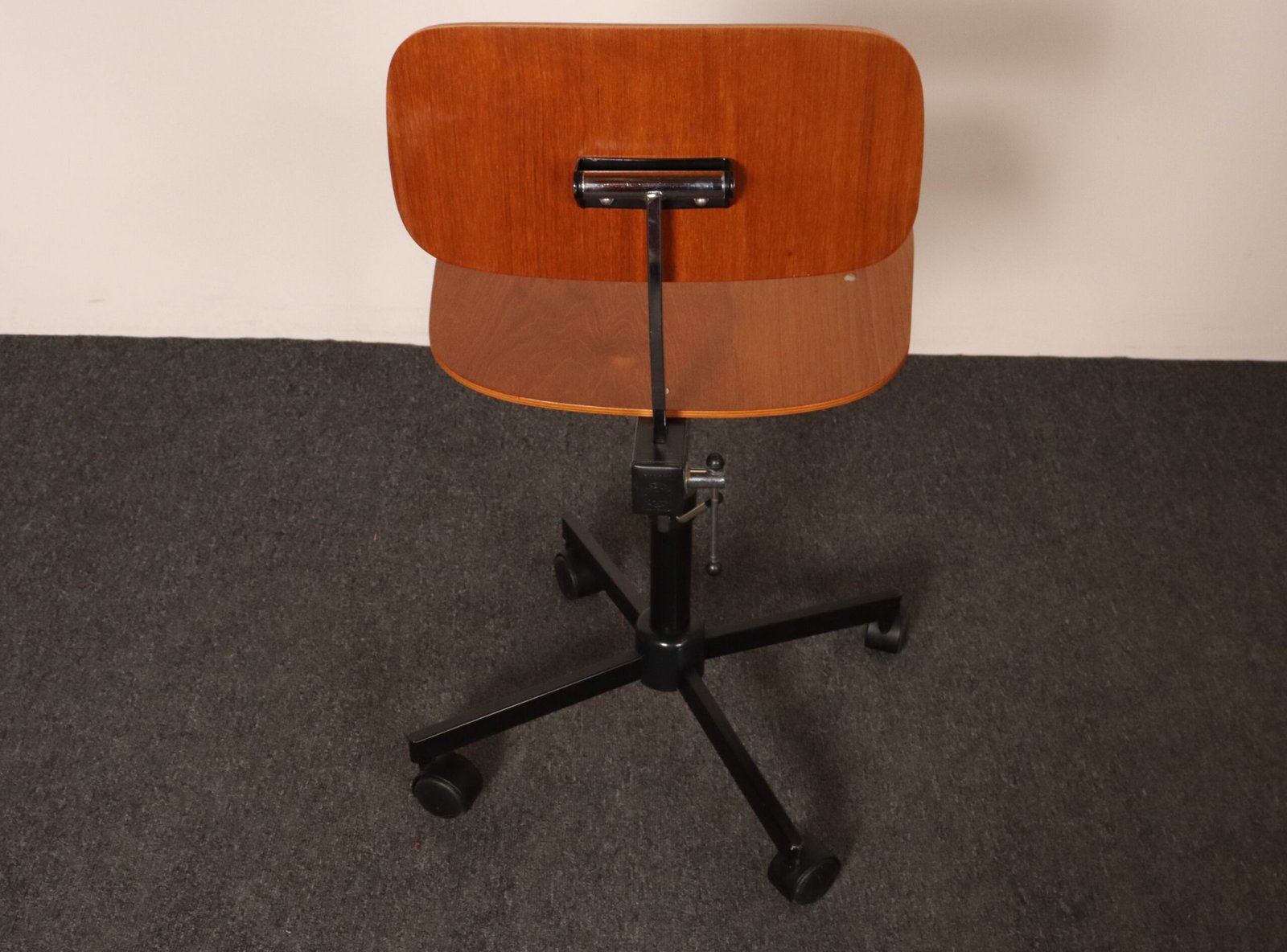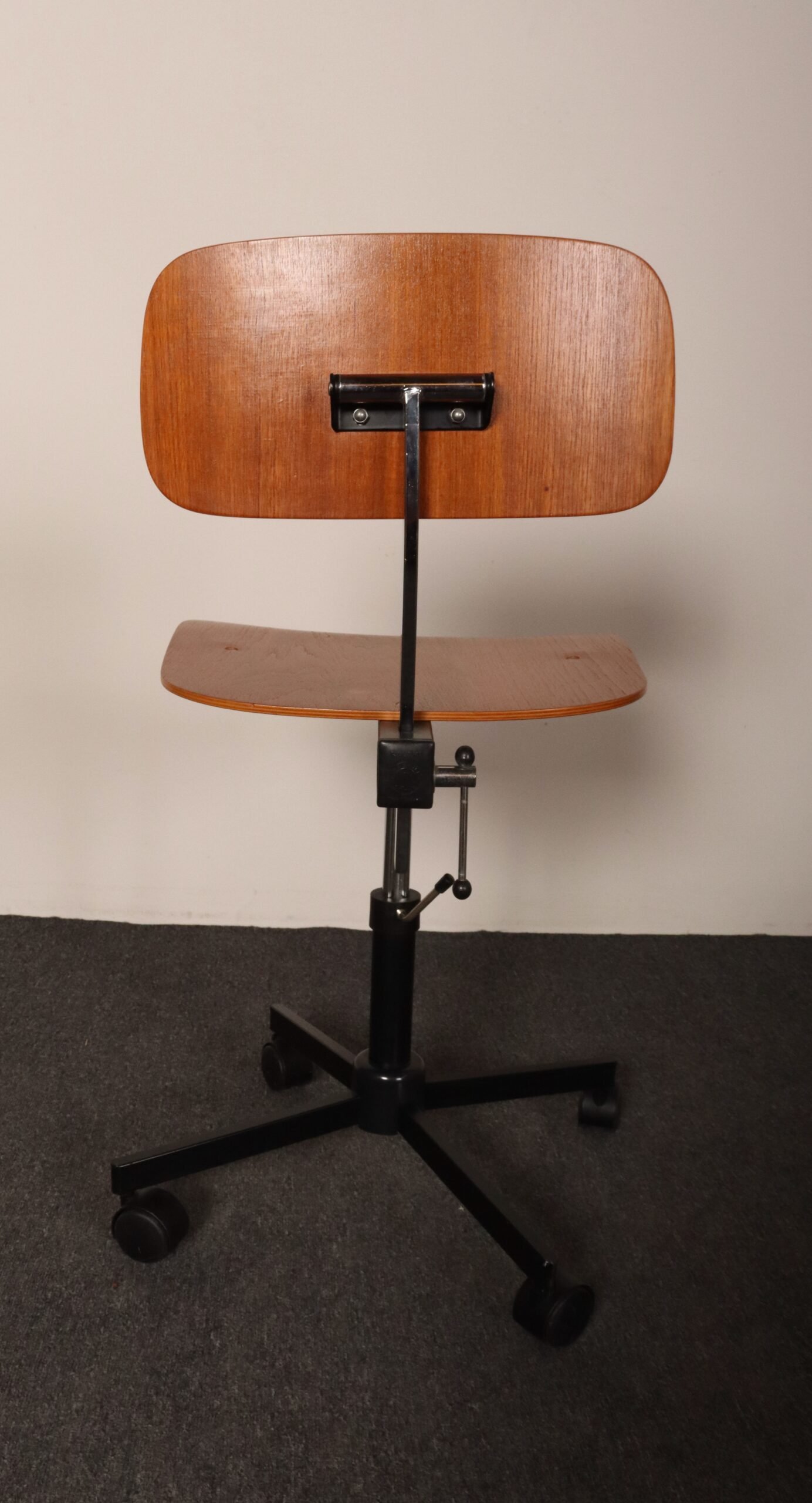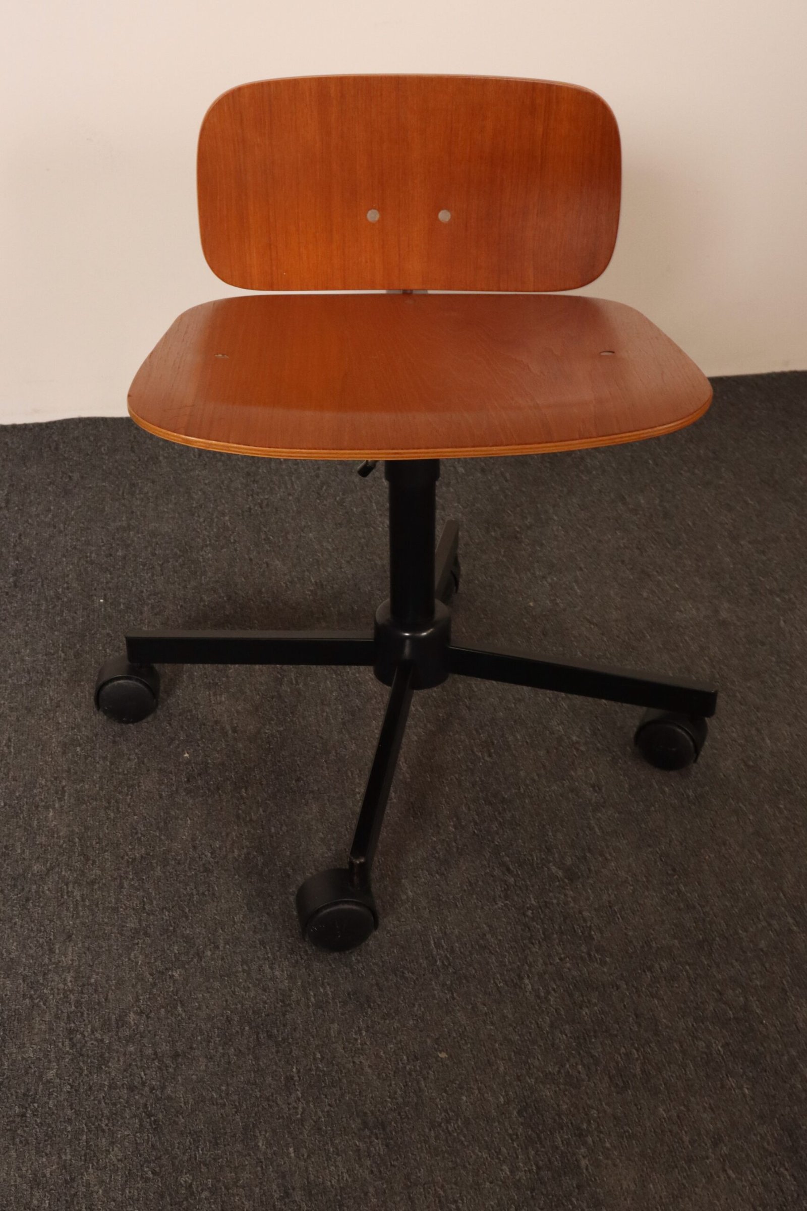Features a molded teak plywood adjustable seat and backrest with black metal swivel base supported by caster wheels.