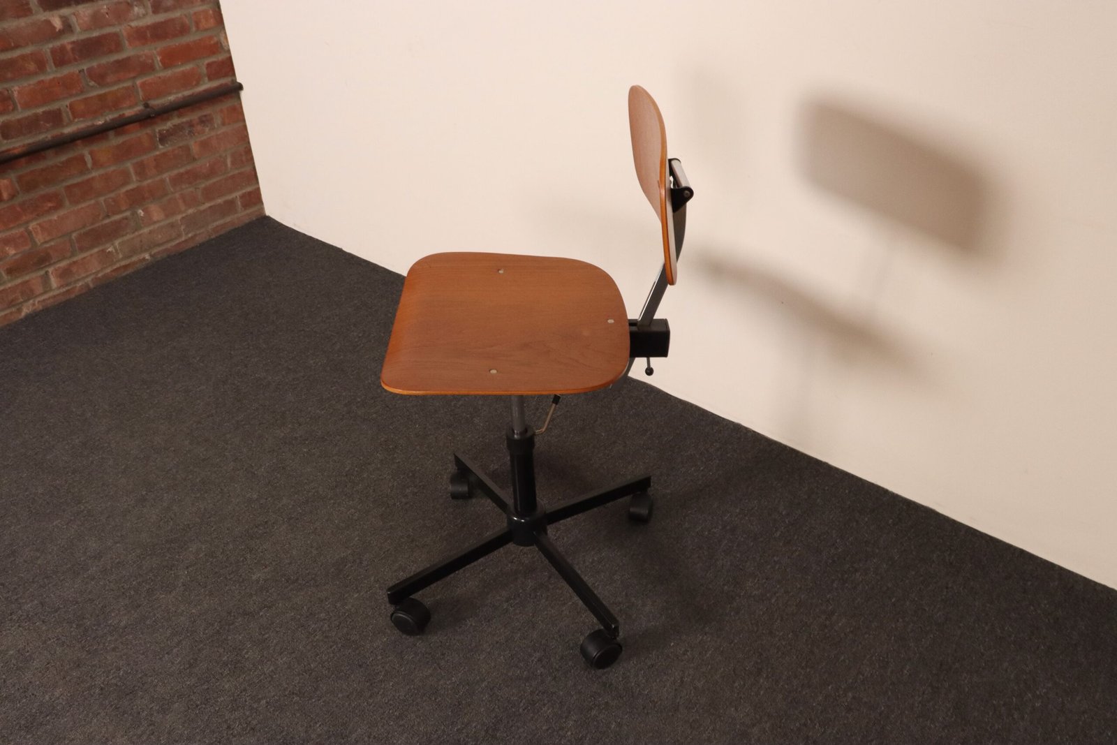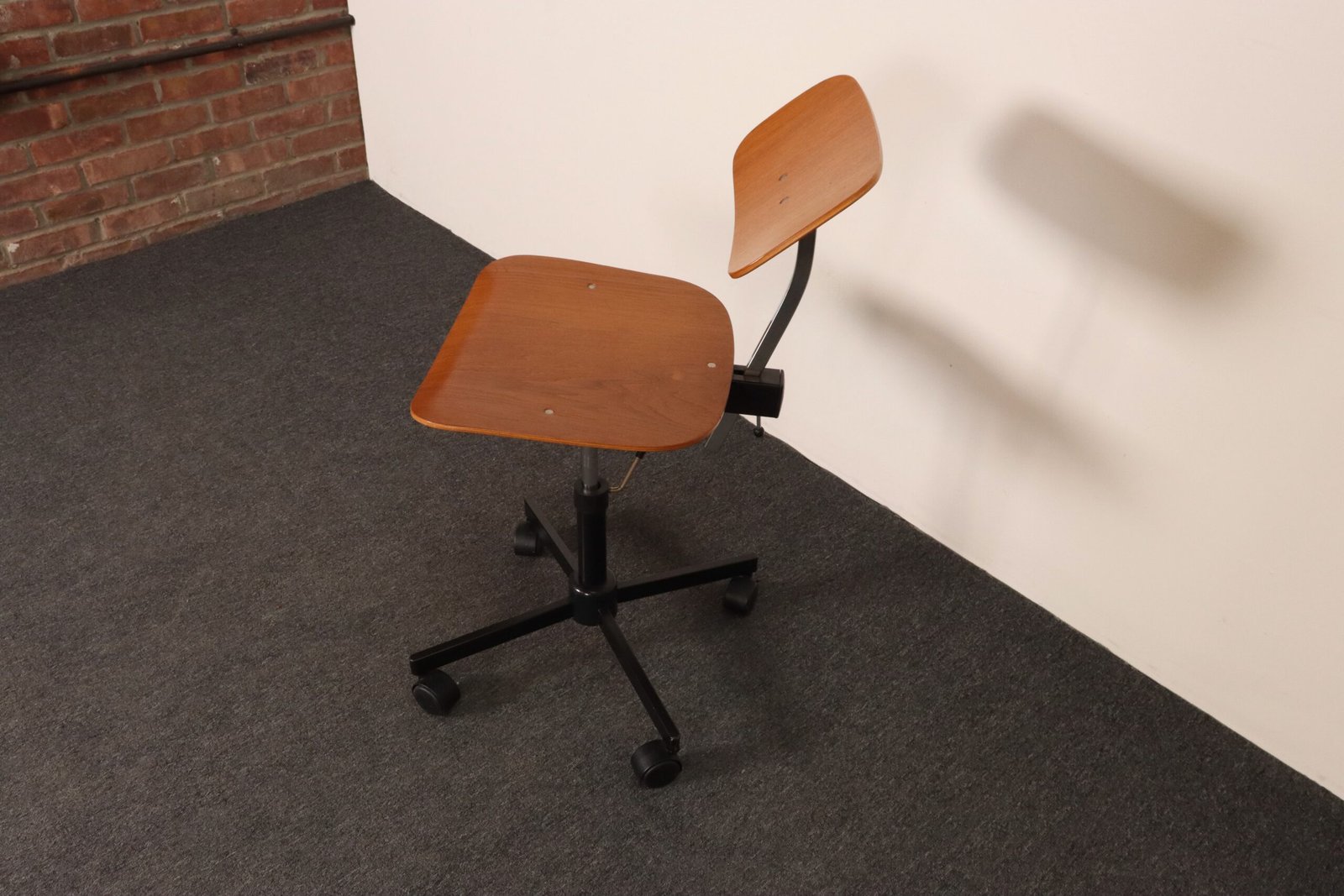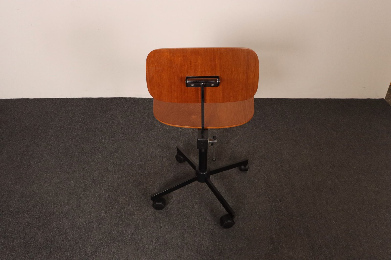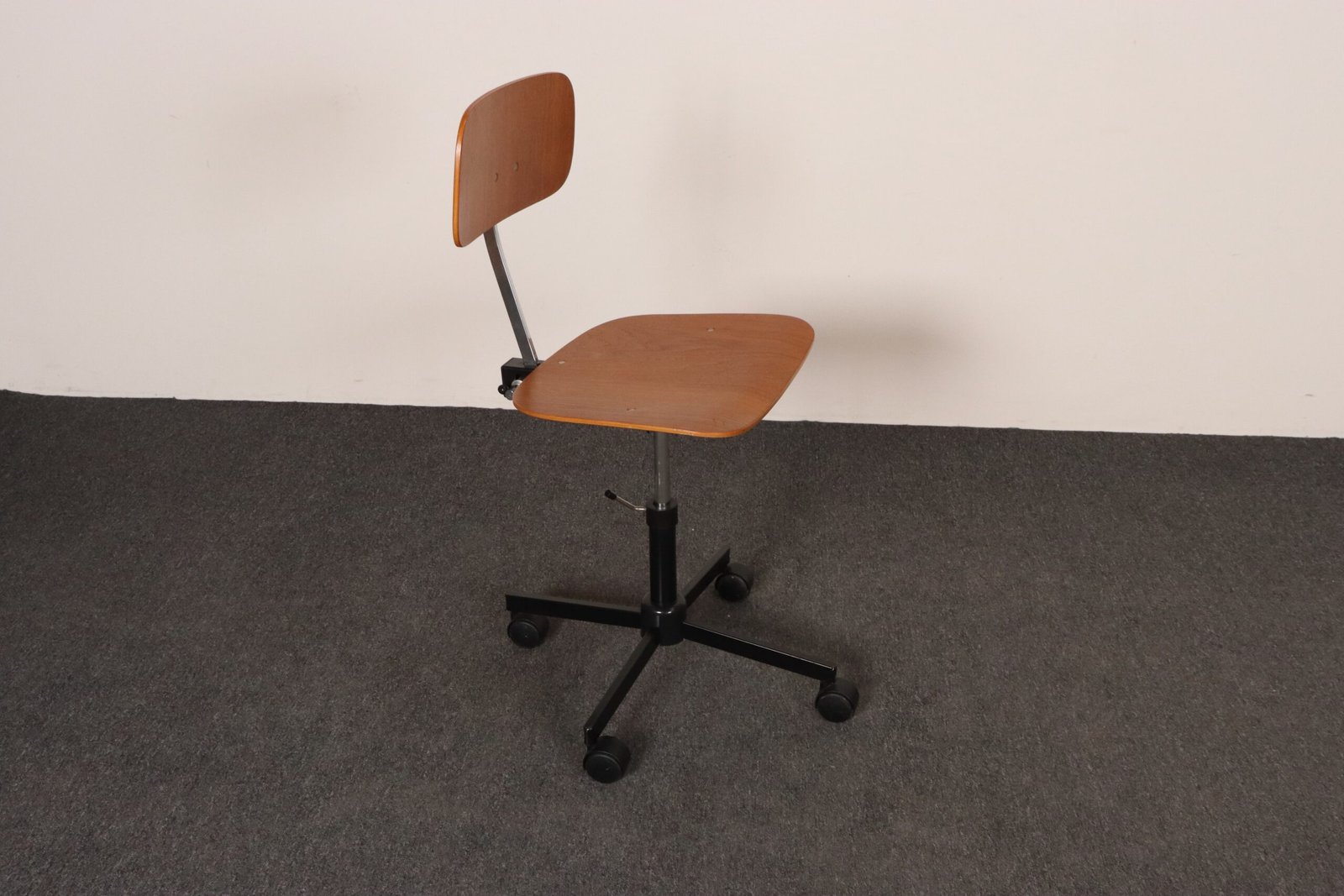 Features a molded teak plywood adjustable seat and backrest with black metal swivel base supported by caster wheels.