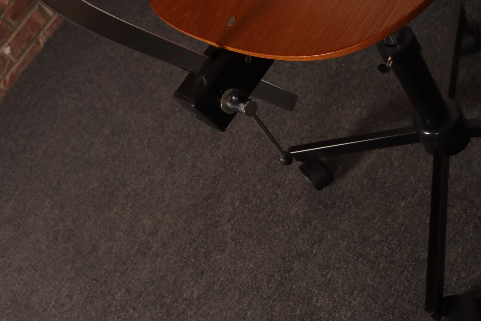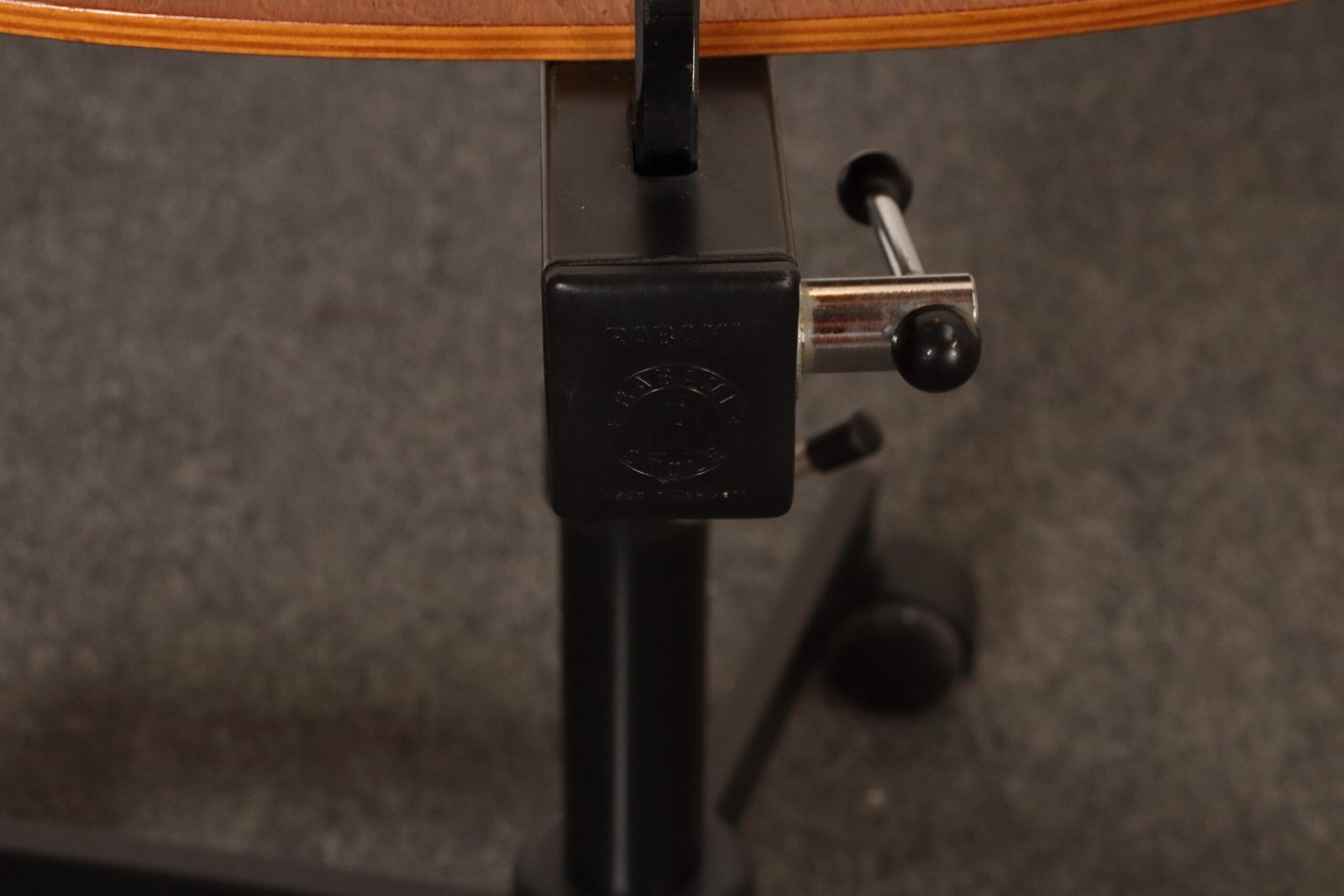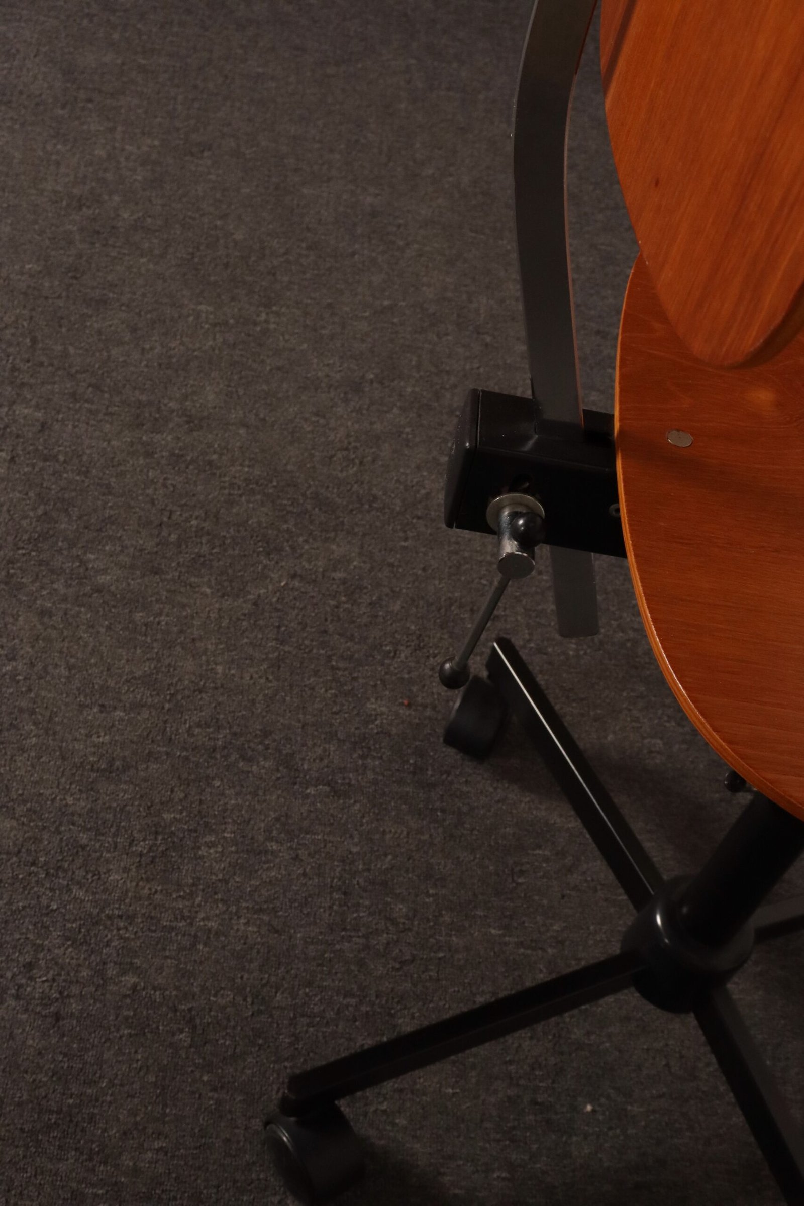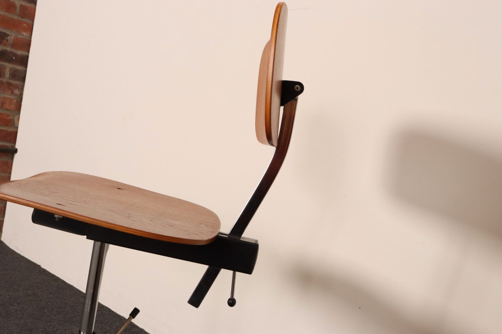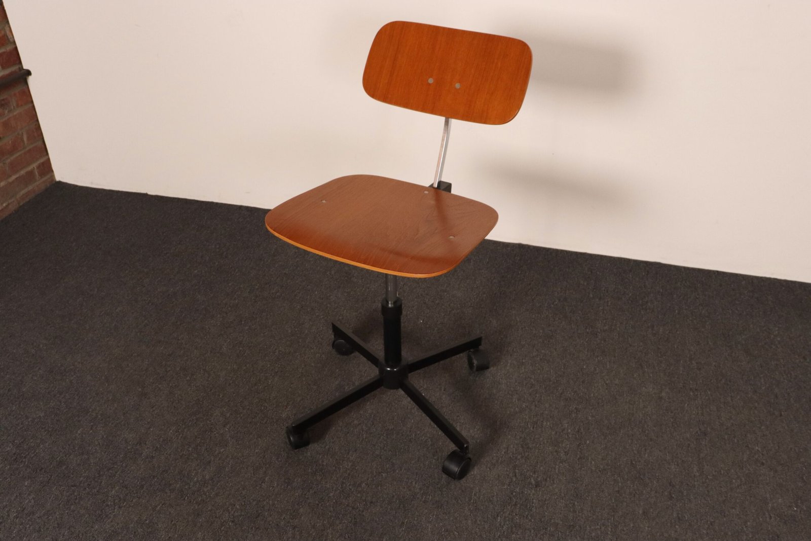 Features a molded teak plywood adjustable seat and backrest with black metal swivel base supported by caster wheels.