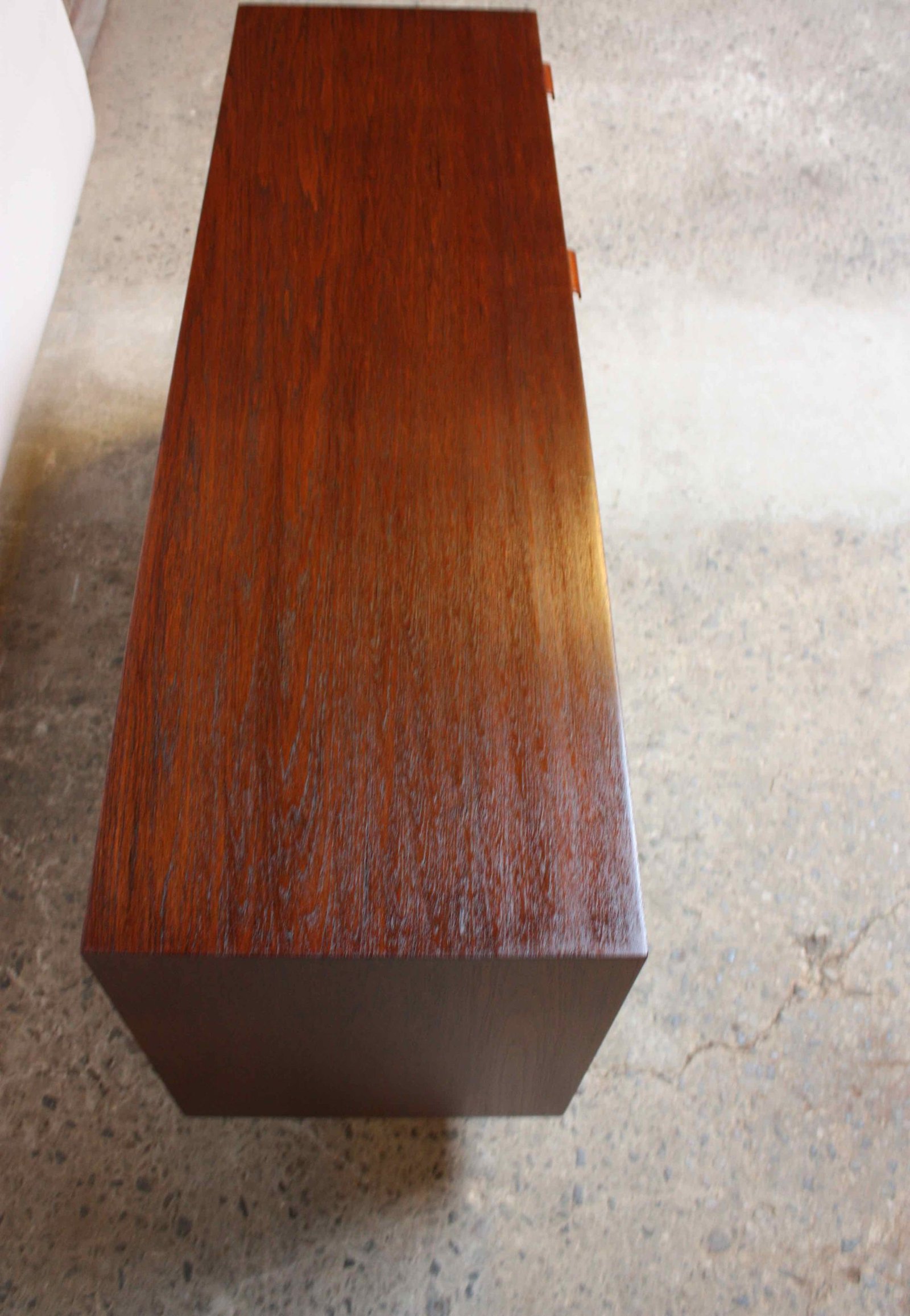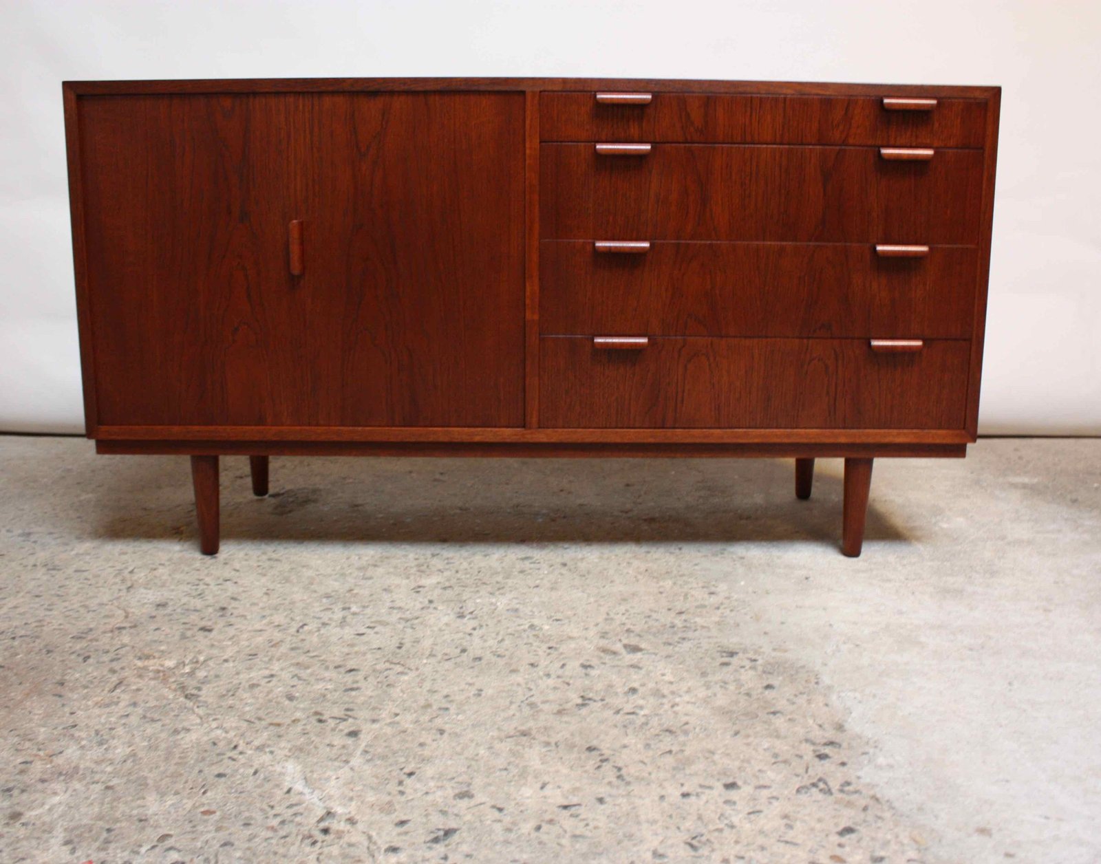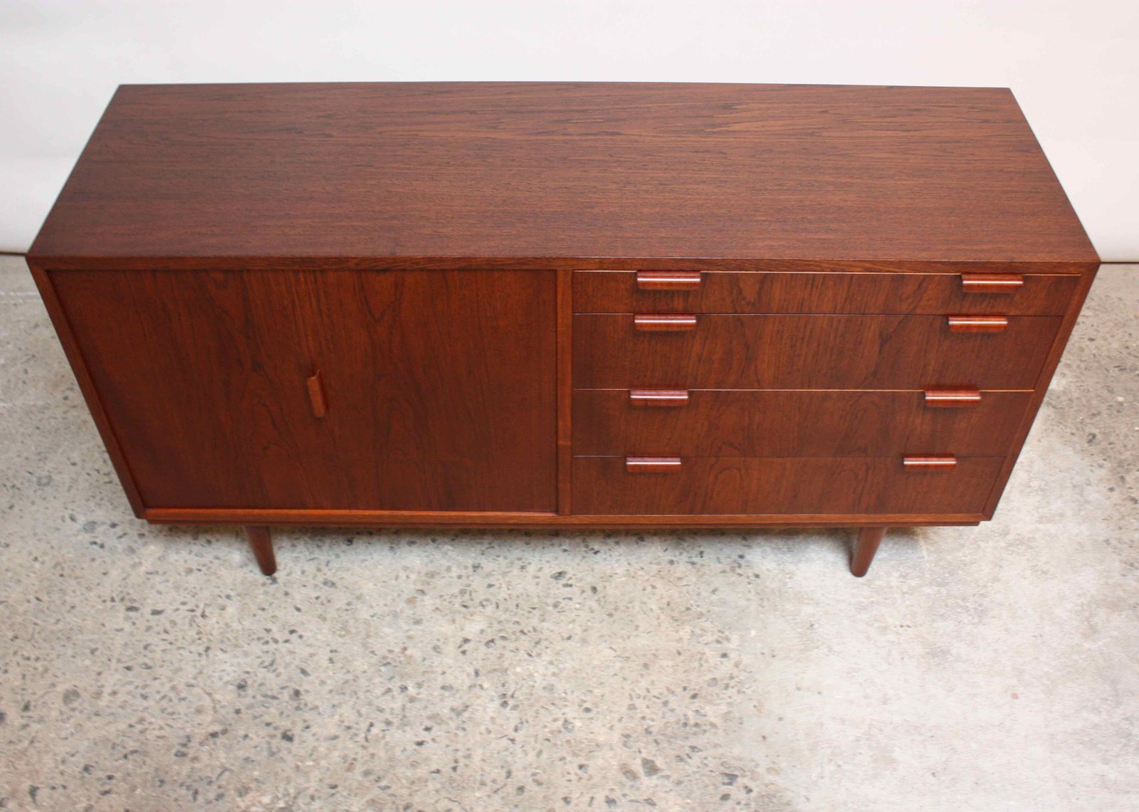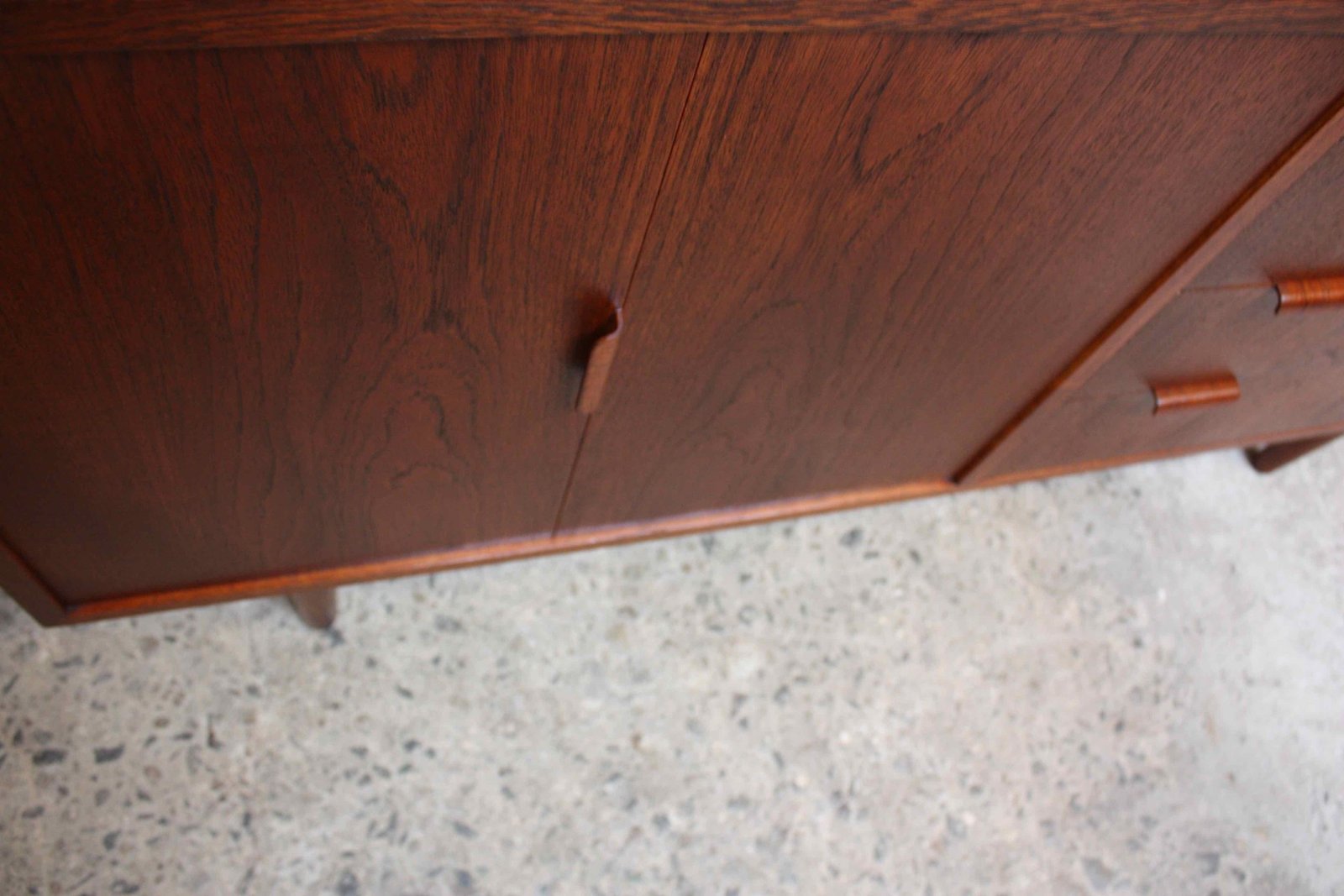 This Danish teak sideboard/cabinet was designed in the 1950s by Carlo Jensen for Poul Hundevad. This small cabinet features a bi-fold door on the left side which opens to reveal a single, adjustable shelf. There are four drawers on the right side for additional storage. The sculptural, bent-teakwood pulls add nice dimension to the piece. The piece is unmarked and the back is unfinished.