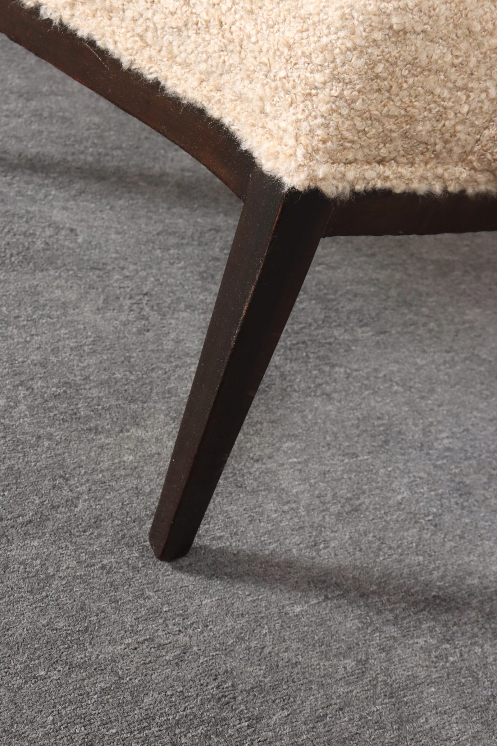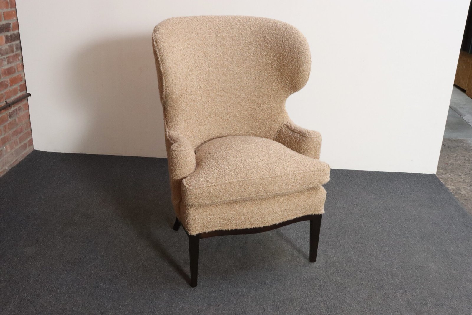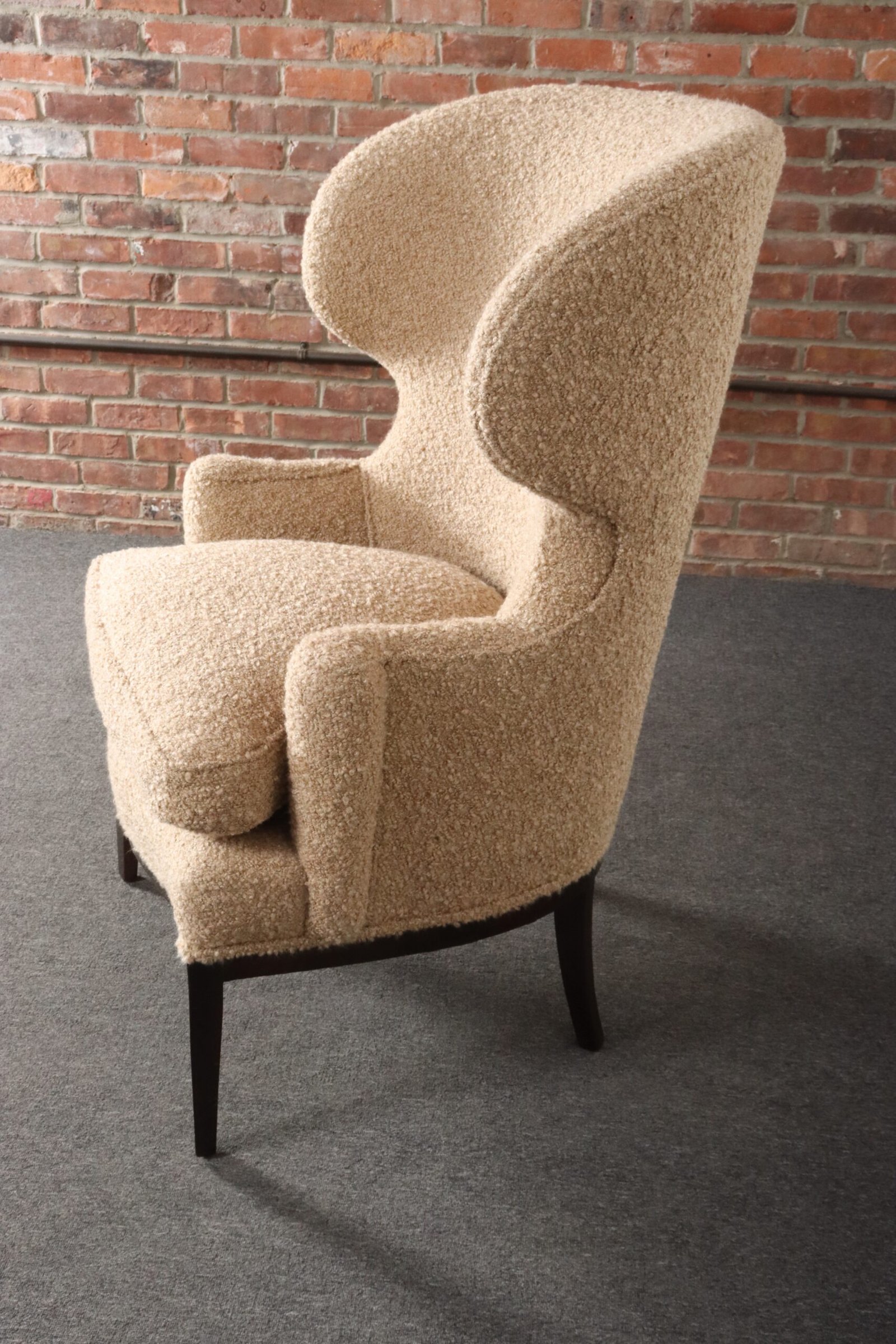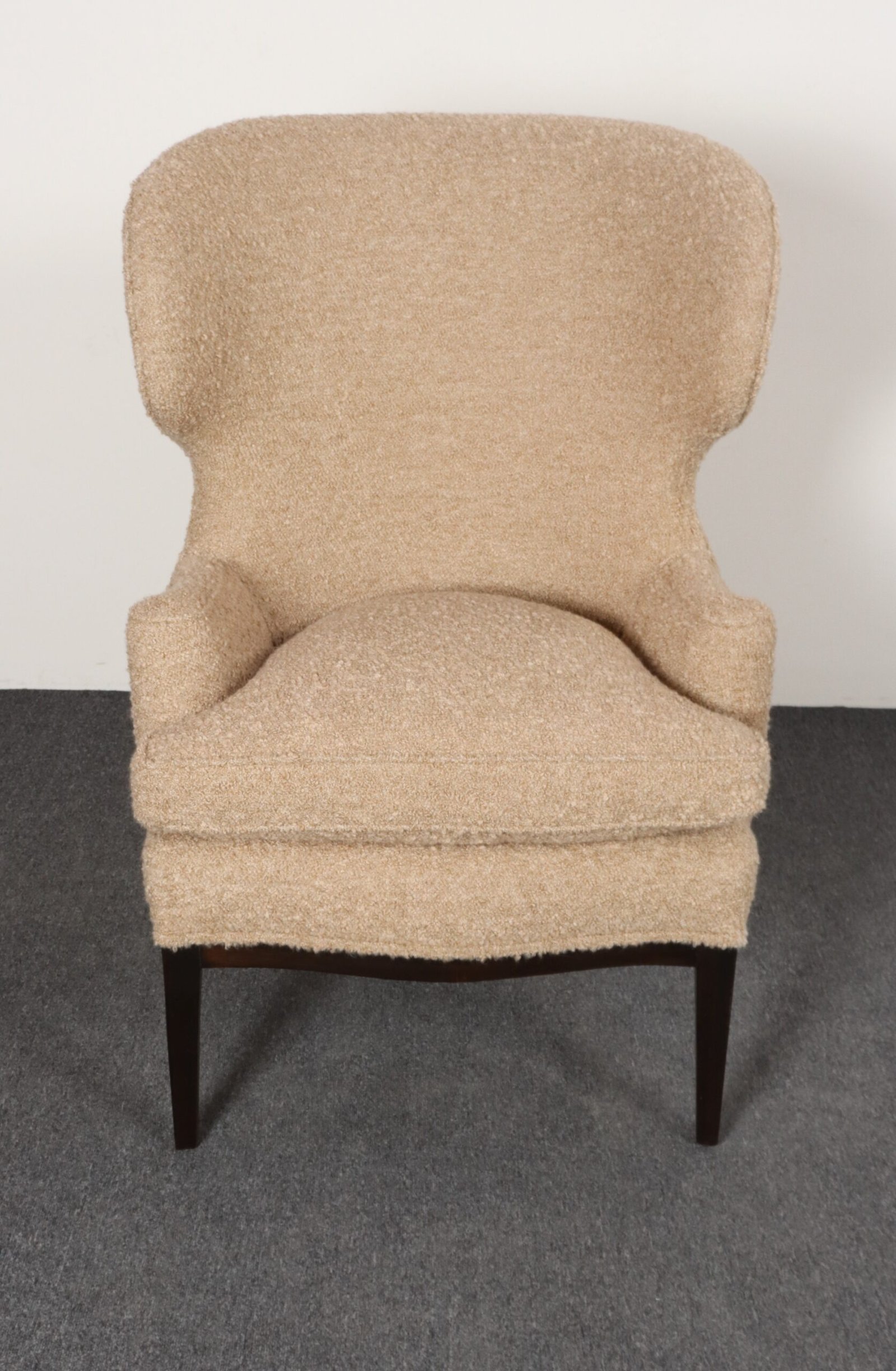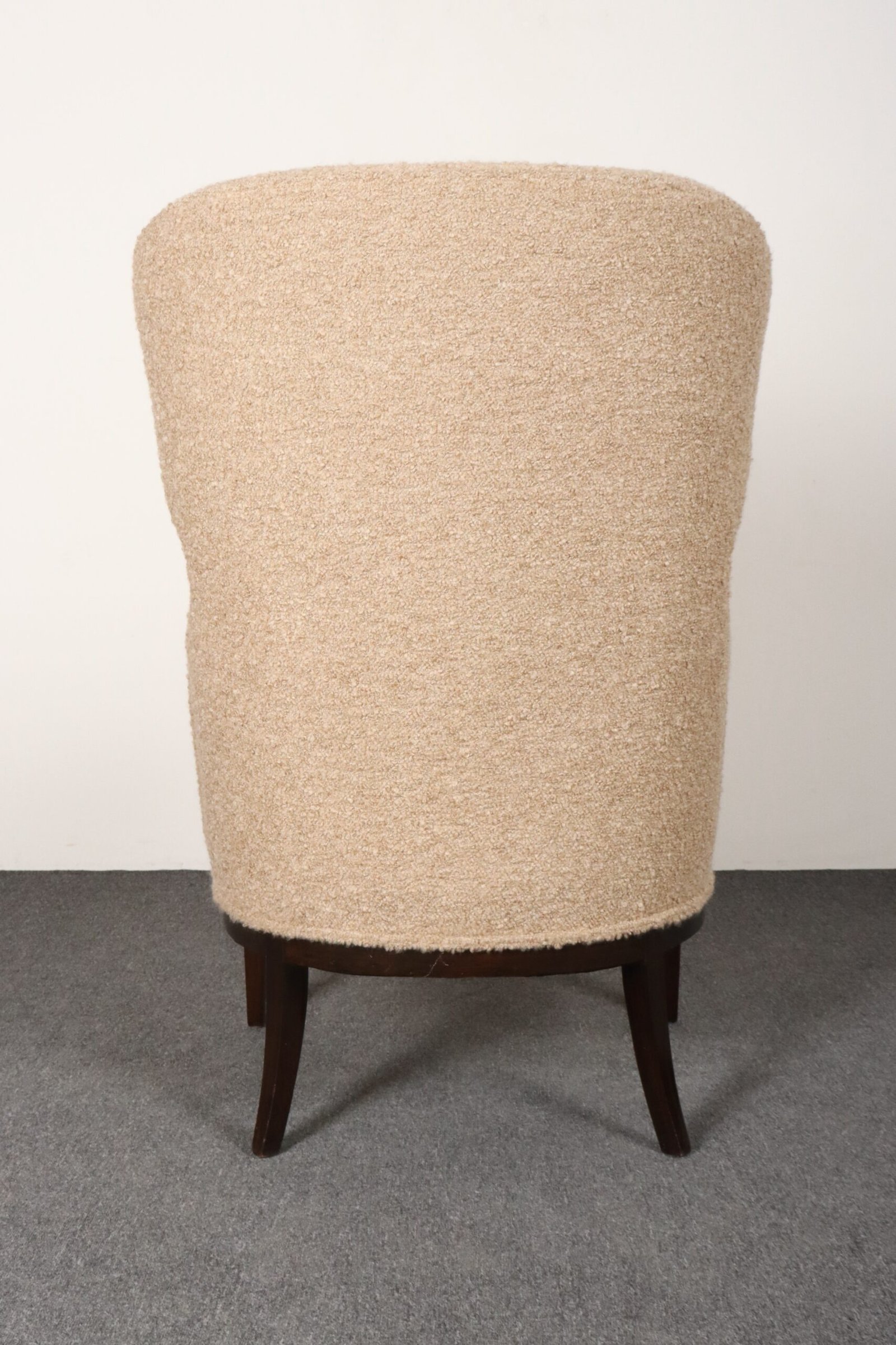 The tawny/gold-brown bouclé and foam are newly replaced (Kravet 36114-166) and stained mahogany is in original condition with minimal wear, as shown.
