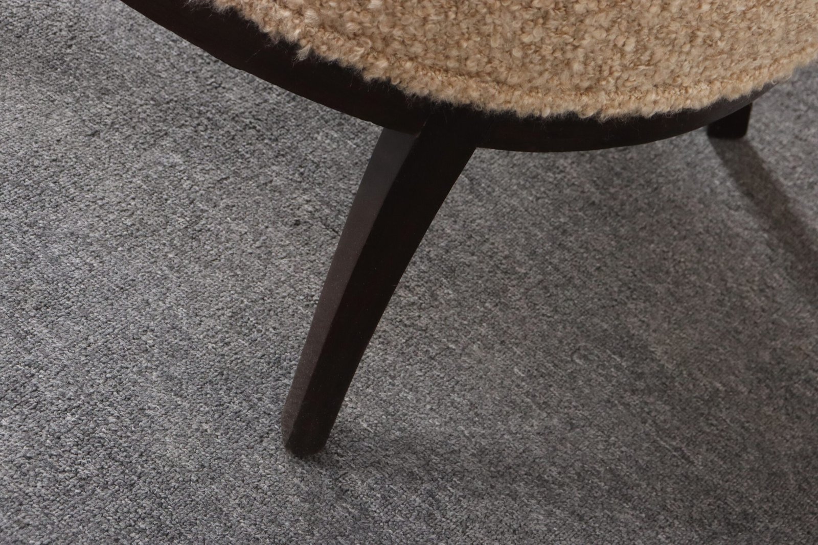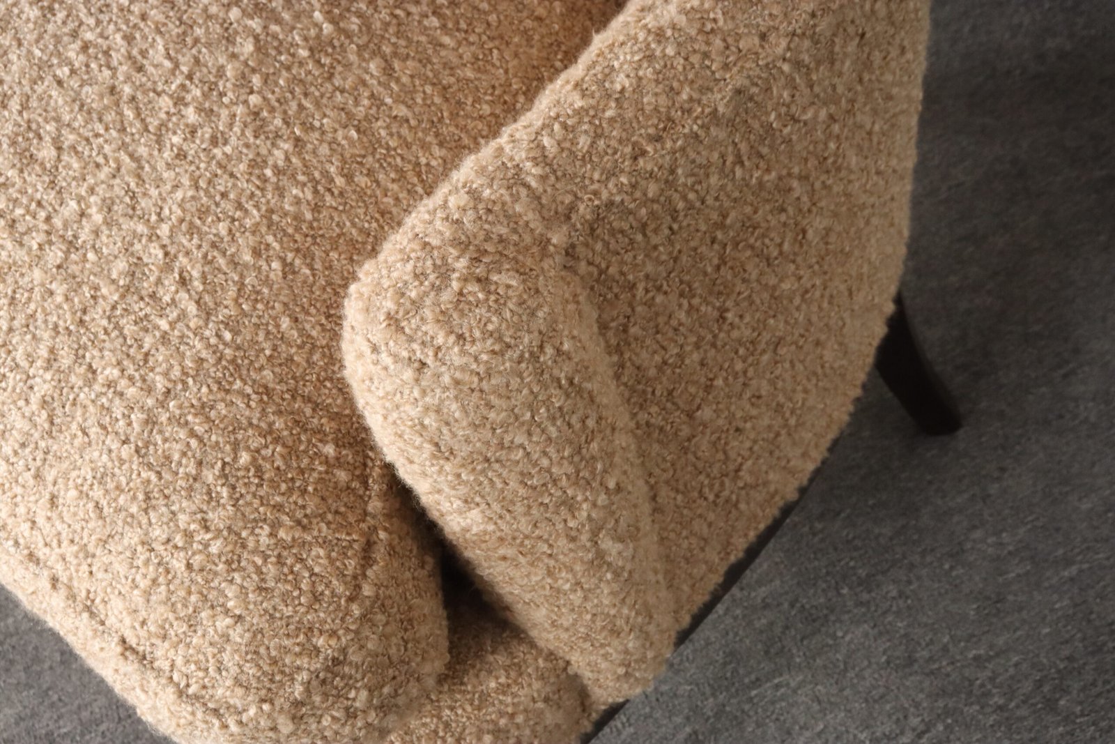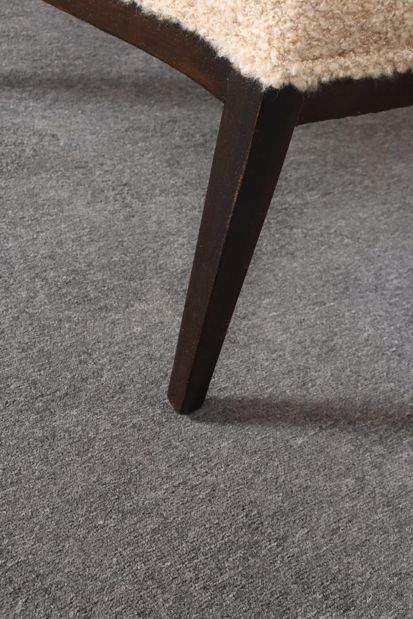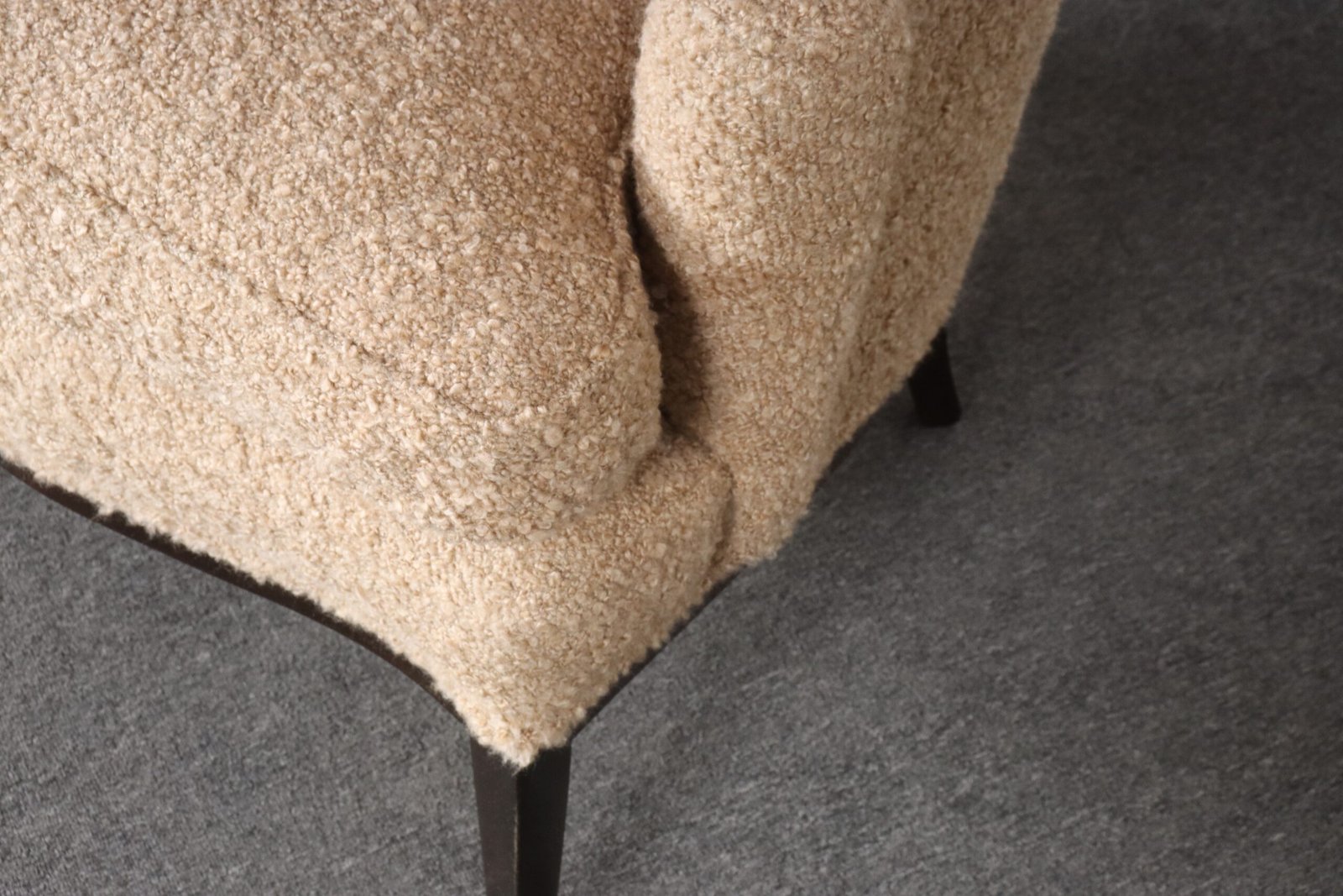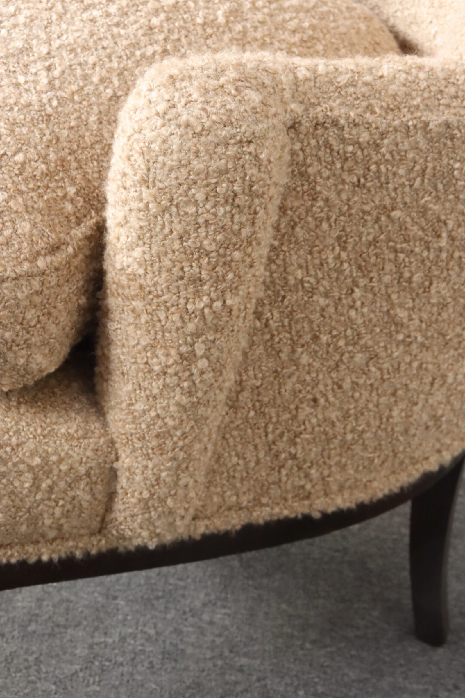 The tawny/gold-brown bouclé and foam are newly replaced (Kravet 36114-166) and stained mahogany is in original condition with minimal wear, as shown.