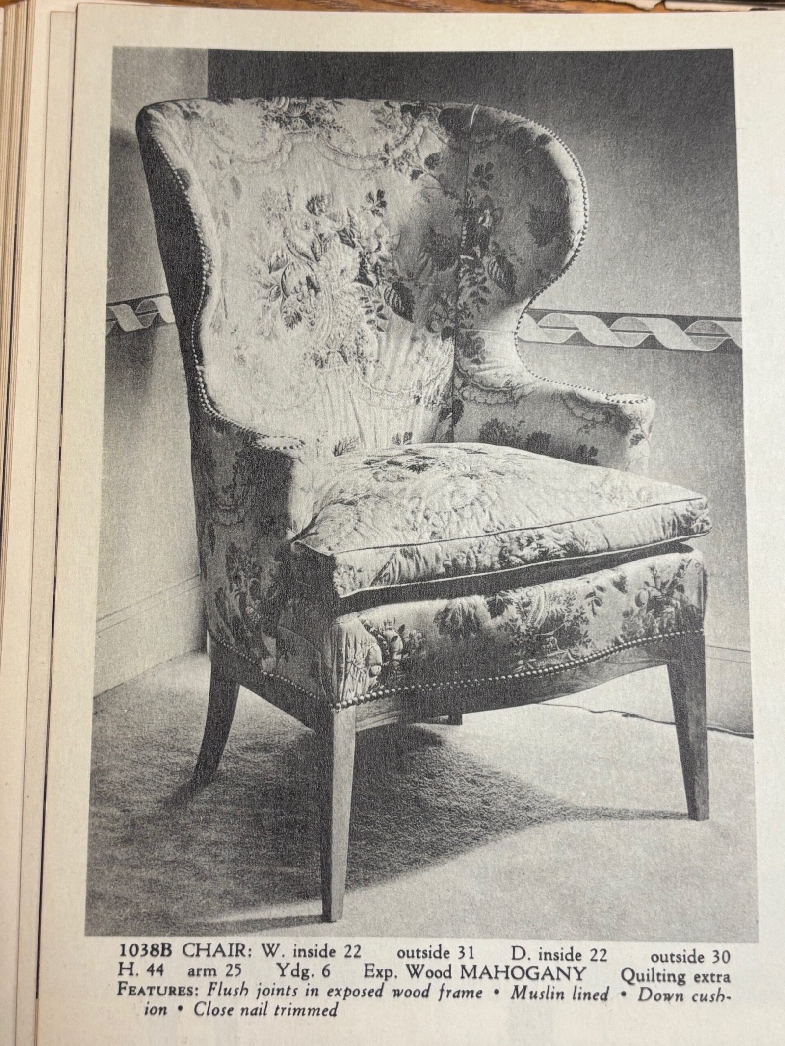 Composed of a stained mahogany base with thin front tapered legs and gently splayed back legs supporting a removable cushion, turned arm rests, and tall wing back, offering substantial support and comfort.