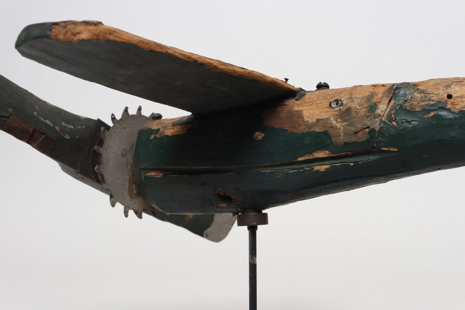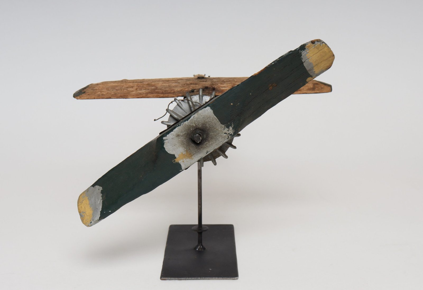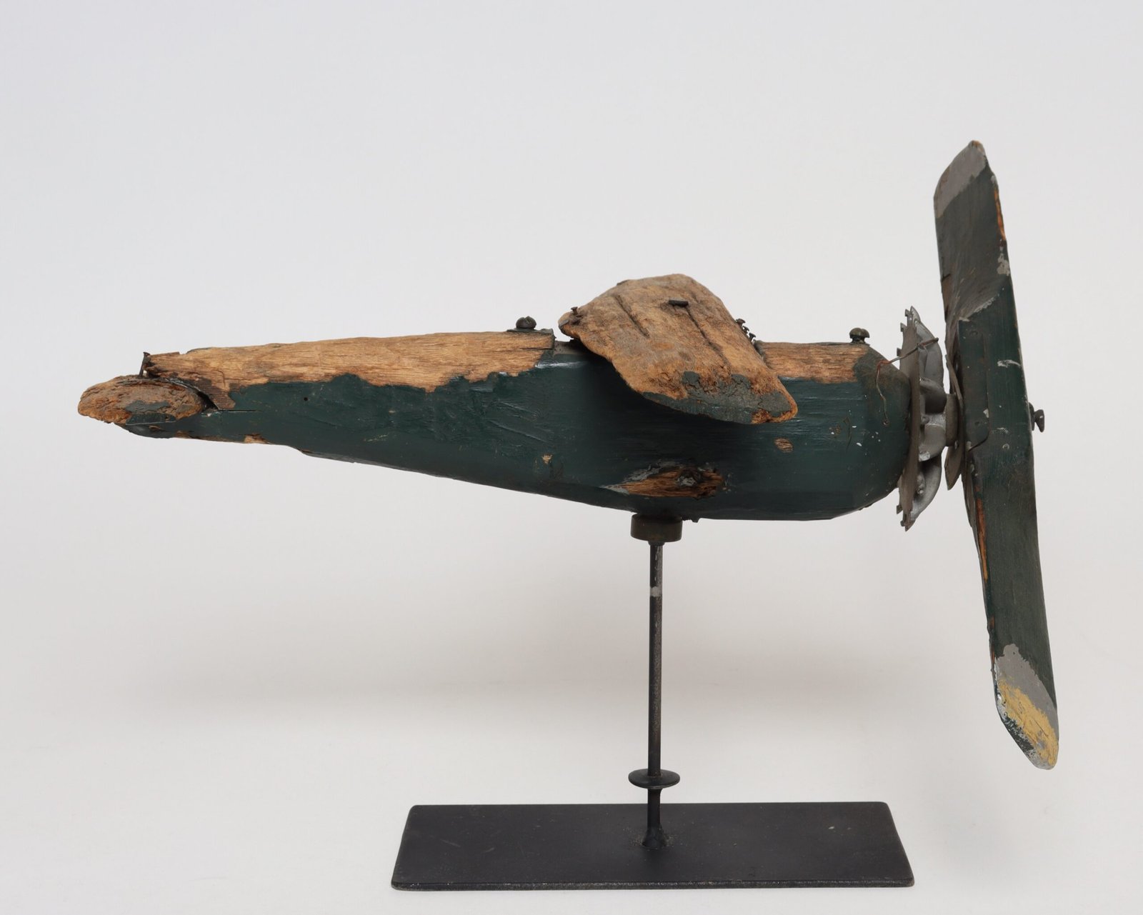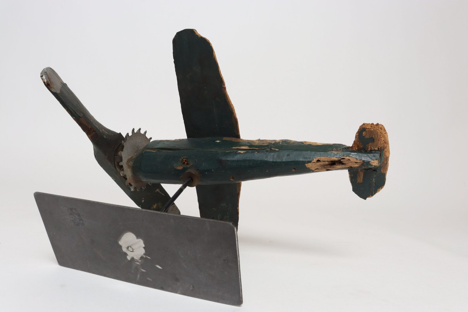 Handmade Folk Art mounted airplane weathervane/whirligig with a functional, spinning propeller (ca. Early-20th Century, USA).