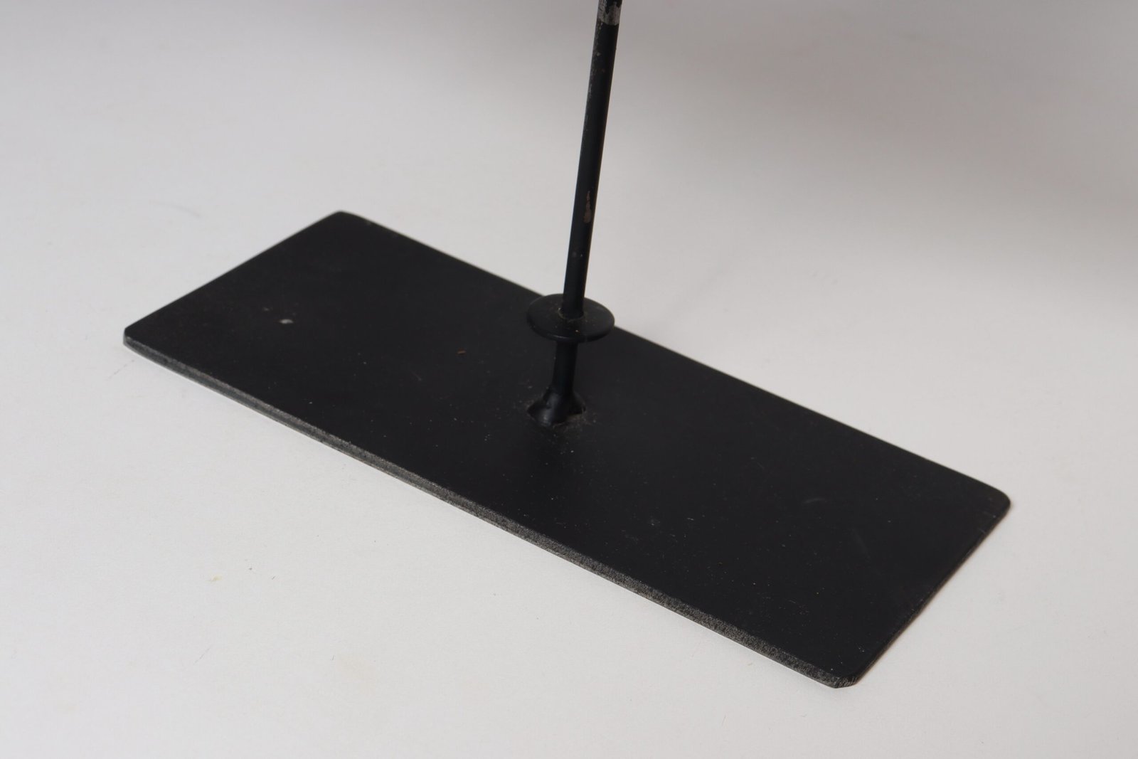 Hand-carved and painted wood with cast aluminum and metal wire details, all supported by a black painted metal base.