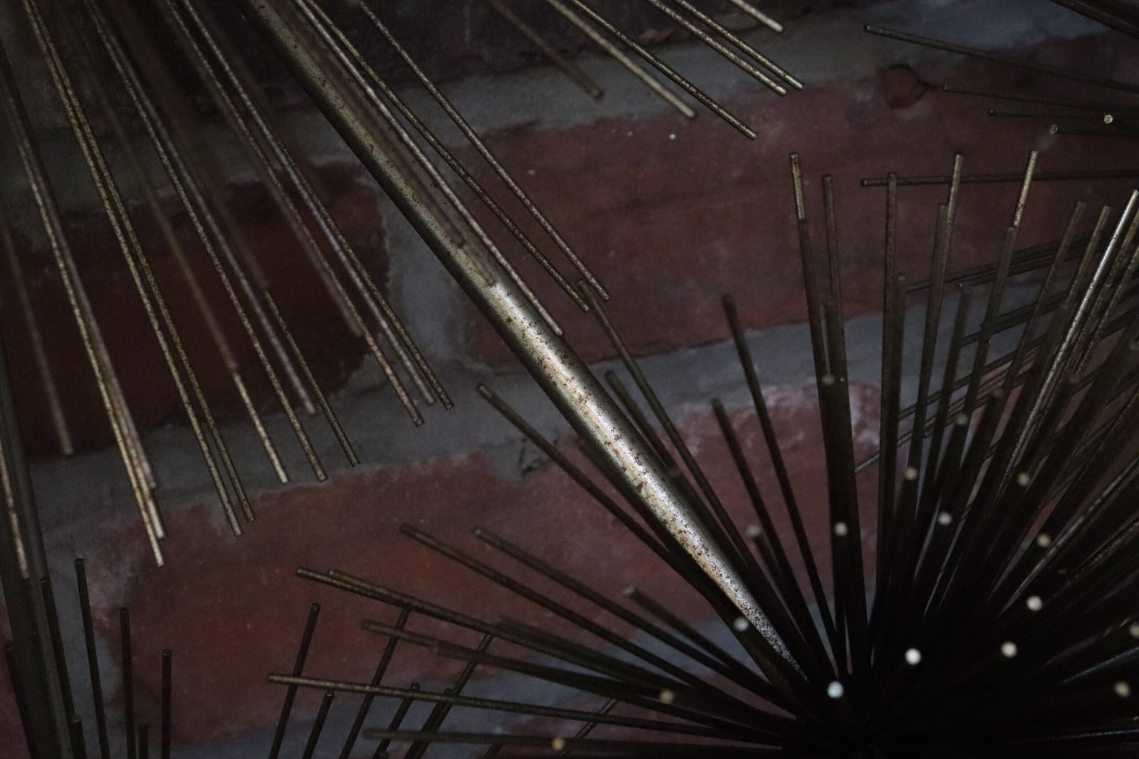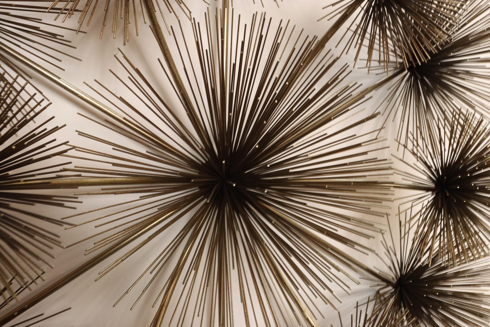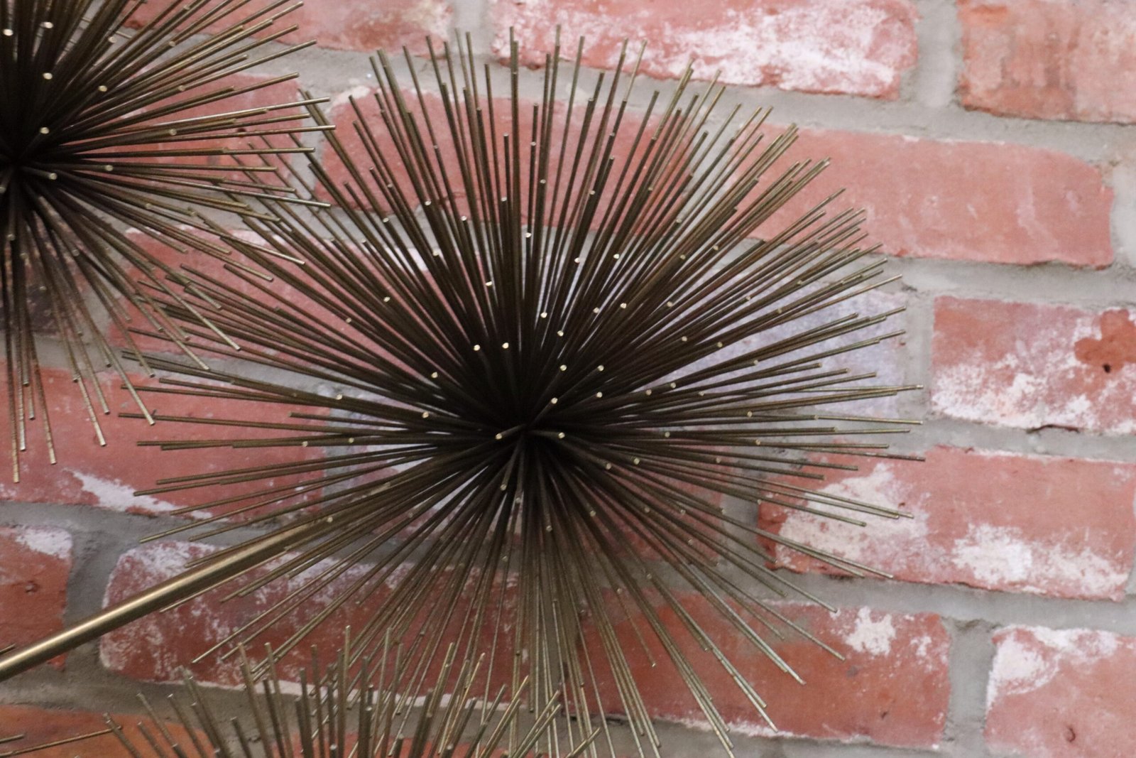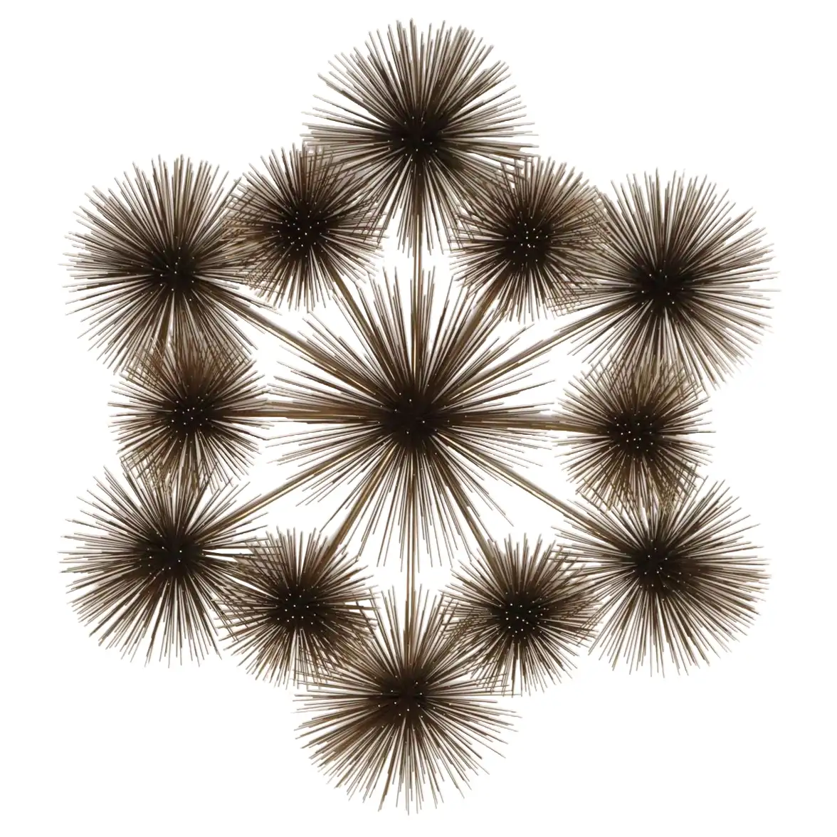 Striking, extra large wall art composed of thirteen individual pom pom/sea urchin forms connected by tubular brass rods.