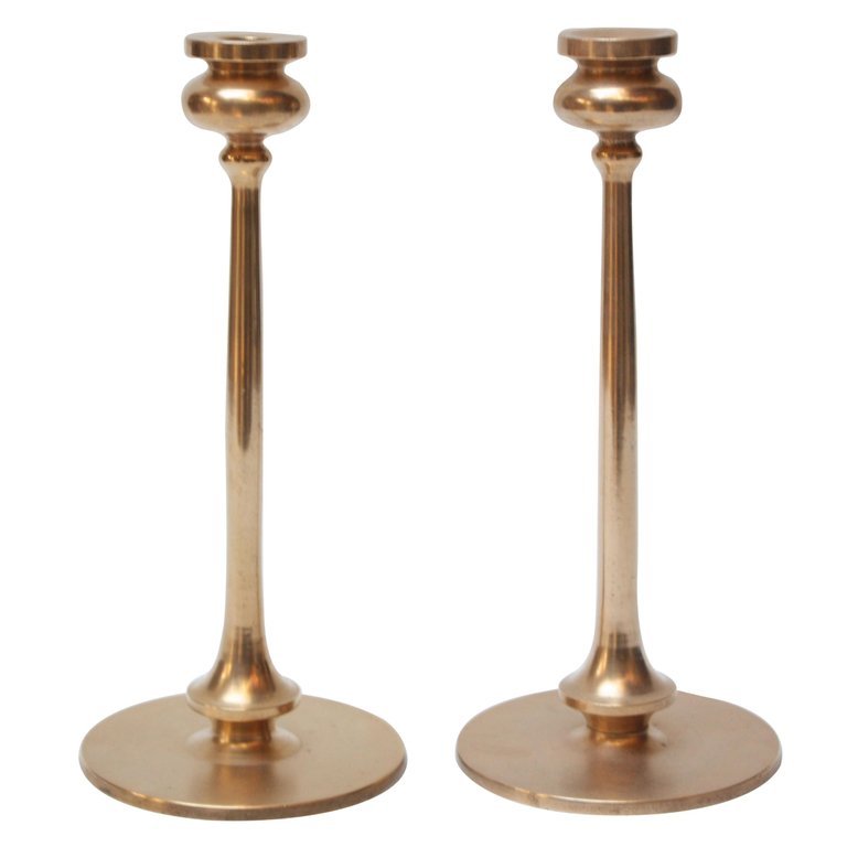 Stunning midcentury turned copper candlesticks composed of shaped bobeches over slender stems on circular bases. Styled after Robert Jarvie, but unsigned.