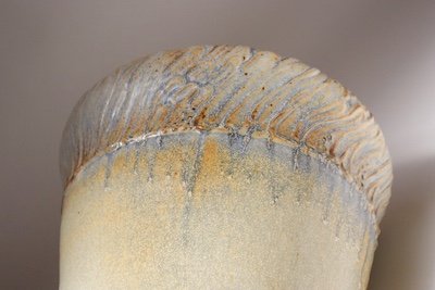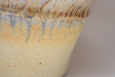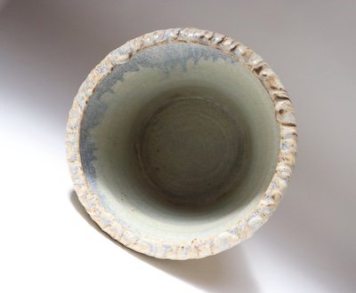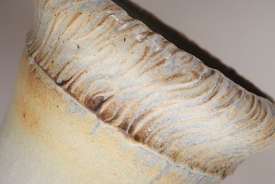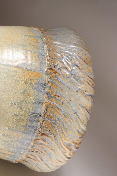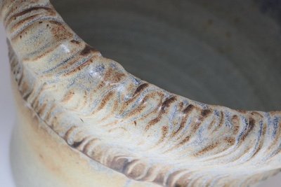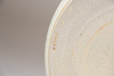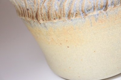 This studio piece dates to the early 1990s, based on the signature “D. Nichols,” which she used during that era and features a design reminiscent of the linear pattern and shape of certain sea shells. The rim decorated with incised sinuous lines protrudes out slightly from the vessel. The beige tones over sky blue base glaze give the piece a gentle, organic quality.