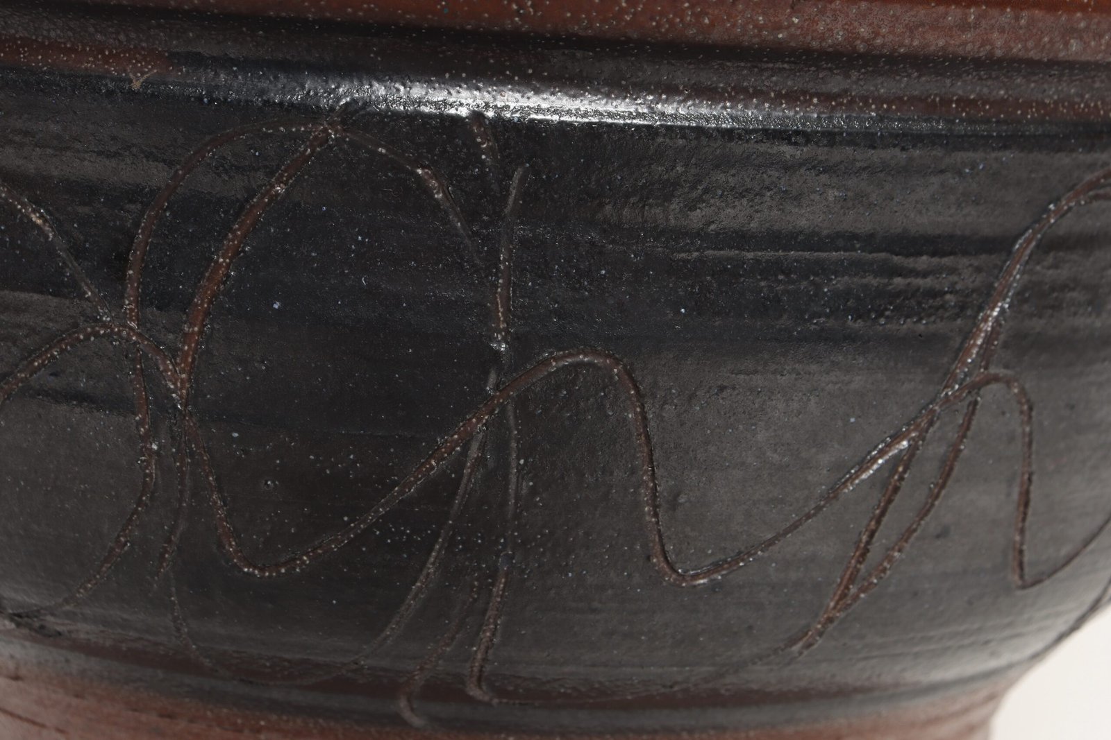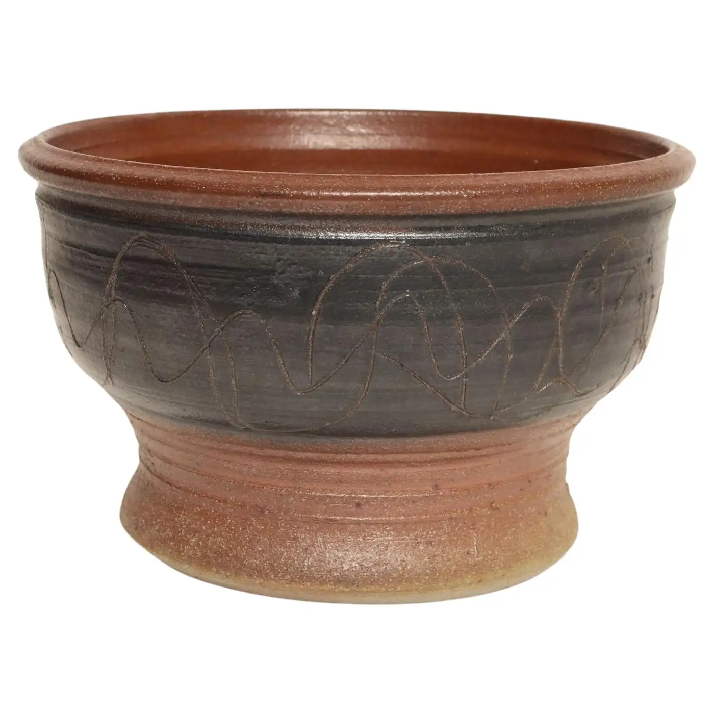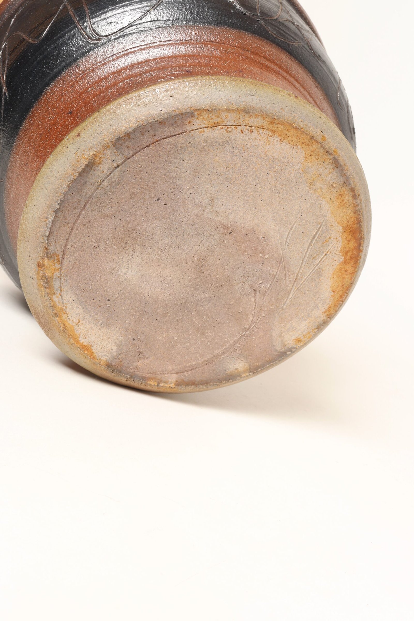 Circa 1979 studio piece in matte charcoal, maroon, and beige glazes with a sgraffito squiggle line motif. Attractive color combination and pattern.
