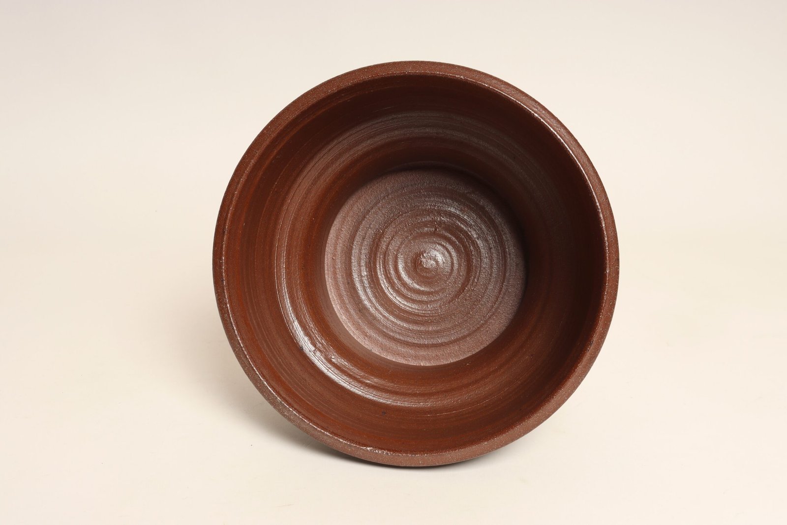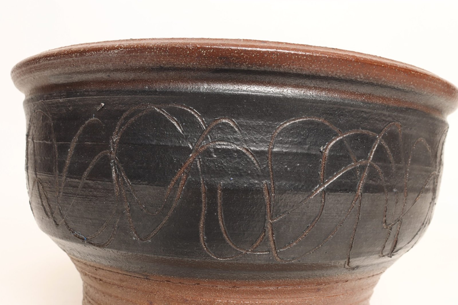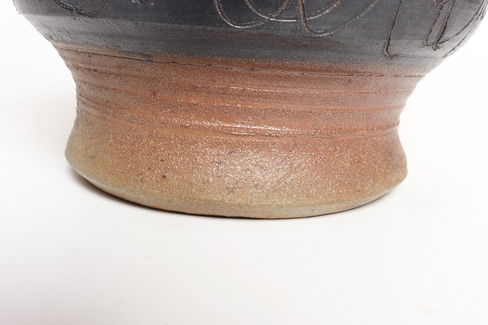 Circa 1979 studio piece in matte charcoal, maroon, and beige glazes with a sgraffito squiggle line motif. Attractive color combination and pattern.