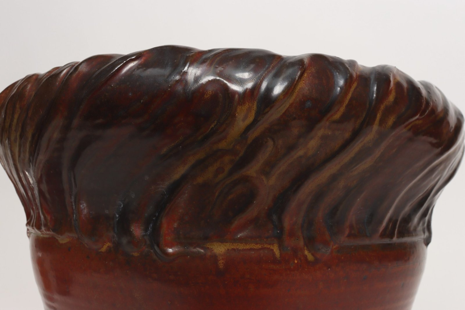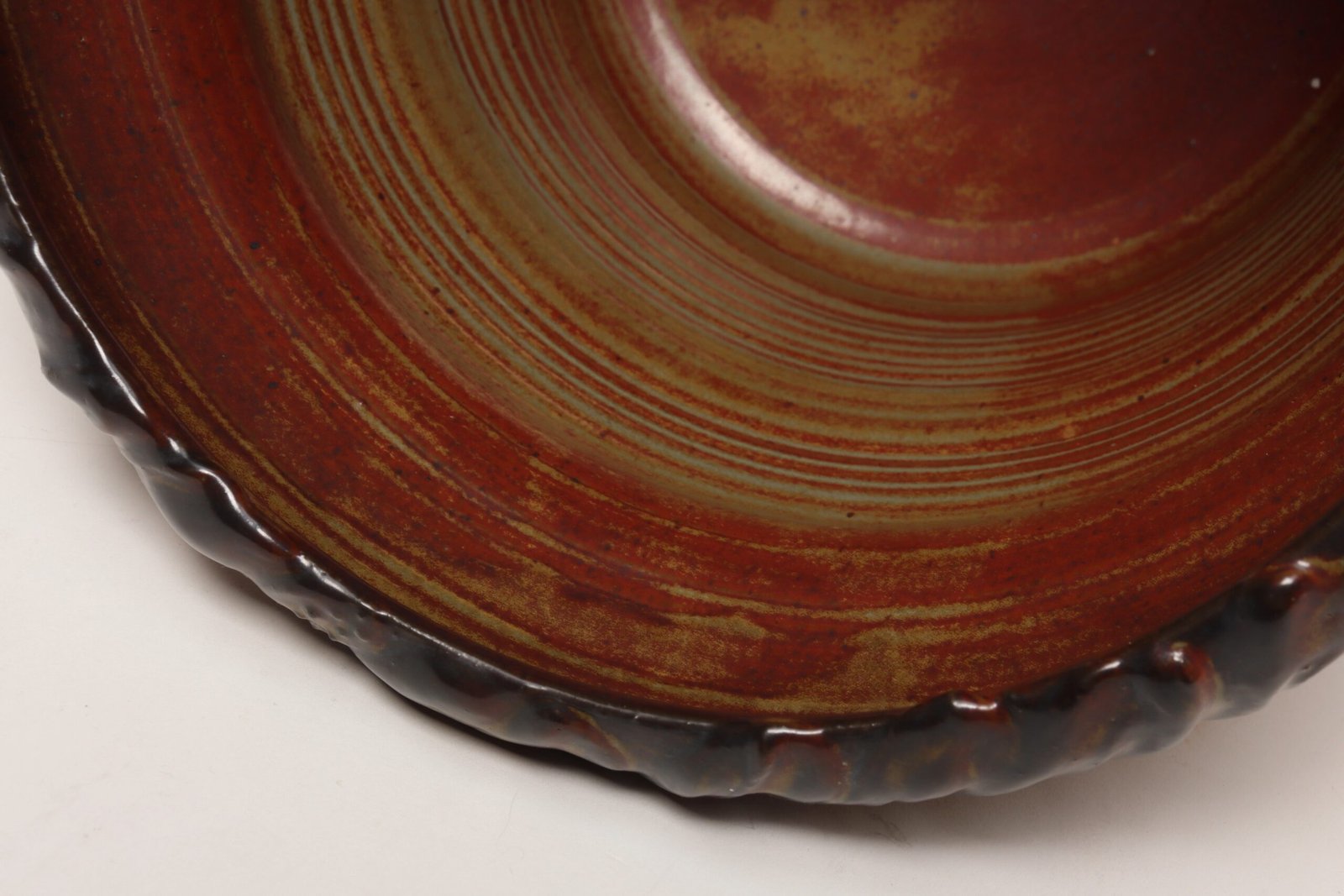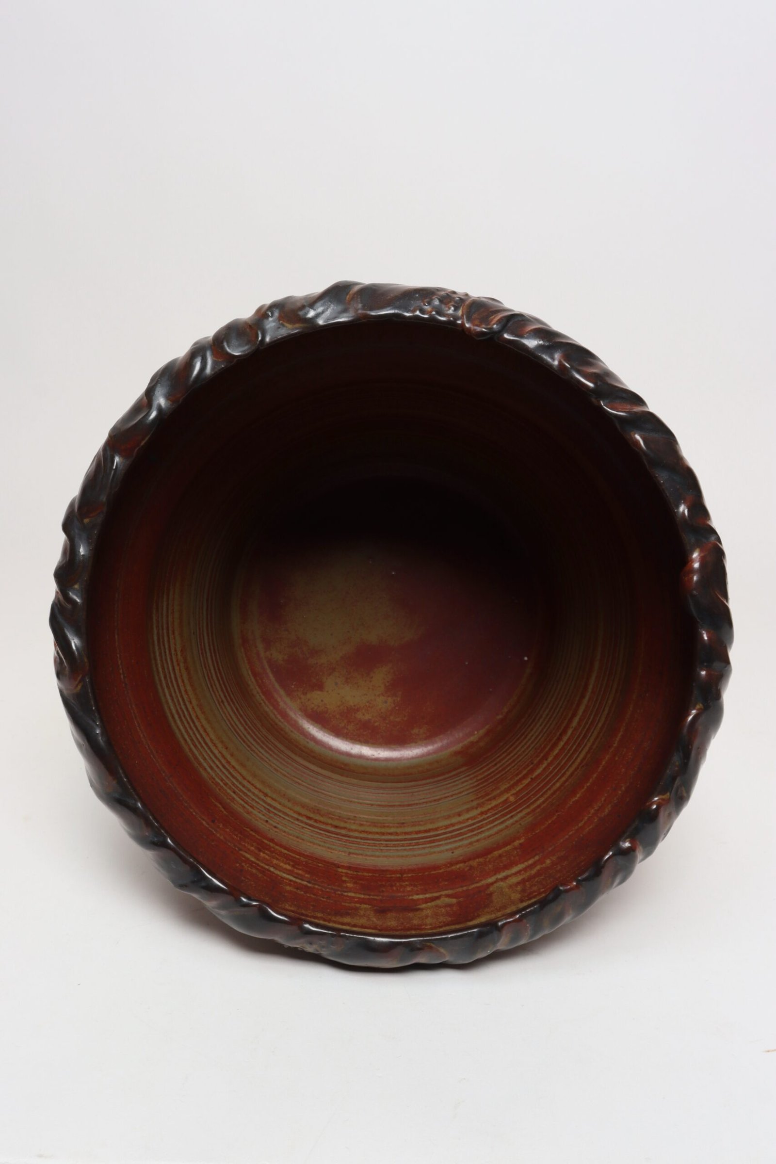 Circa 1979 studio piece featuring a design reminiscent of the linear pattern and shape of certain sea shells. The rim decorated with incised sinuous lines protrudes out slightly from the vessel. Attractive deep crimson glaze with ochre and slate rim in both matte and contrasting metallic glazes.