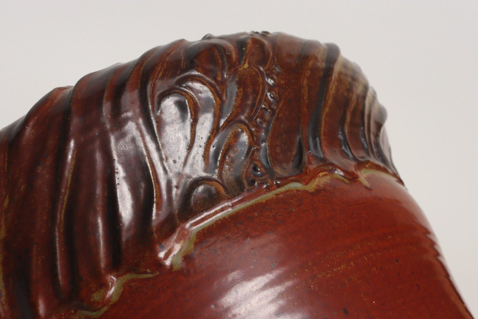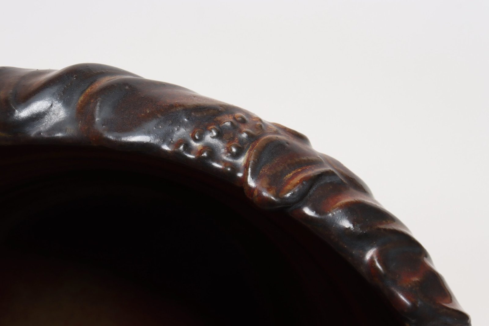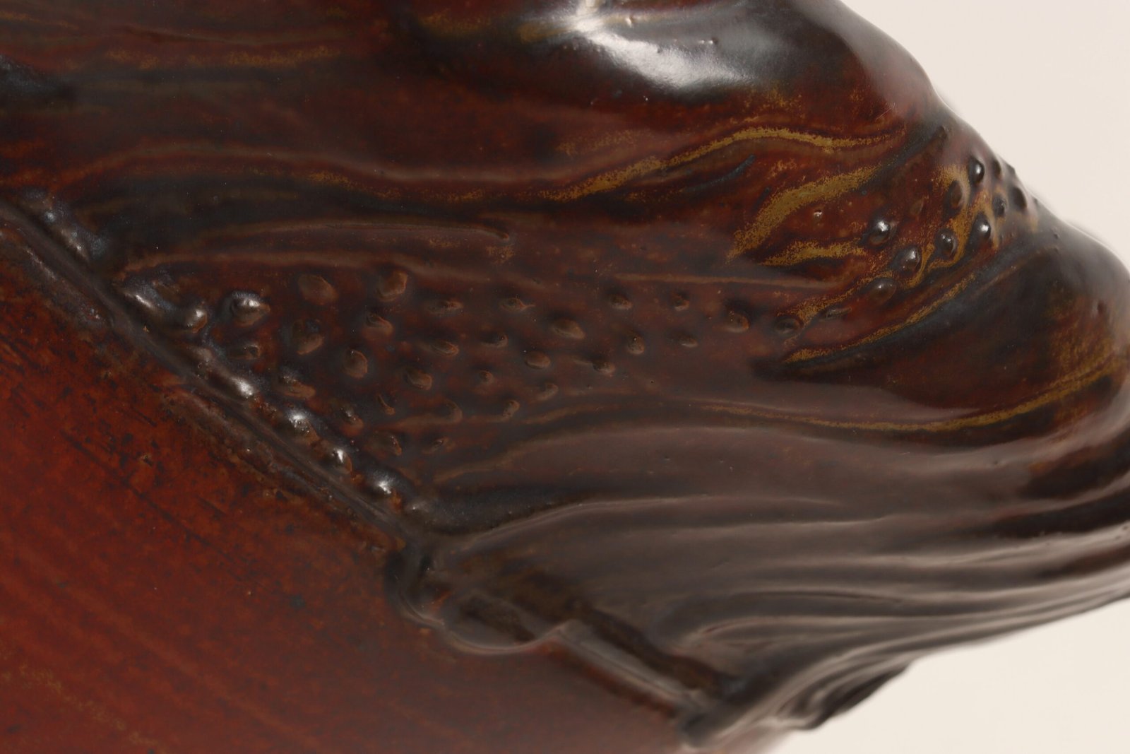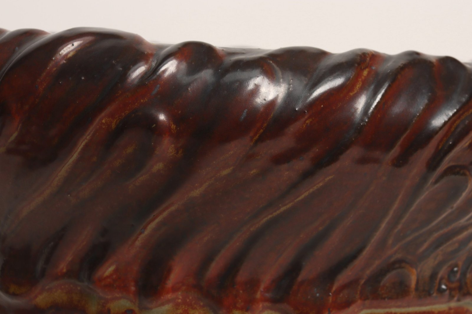 Circa 1979 studio piece featuring a design reminiscent of the linear pattern and shape of certain sea shells. The rim decorated with incised sinuous lines protrudes out slightly from the vessel. Attractive deep crimson glaze with ochre and slate rim in both matte and contrasting metallic glazes.