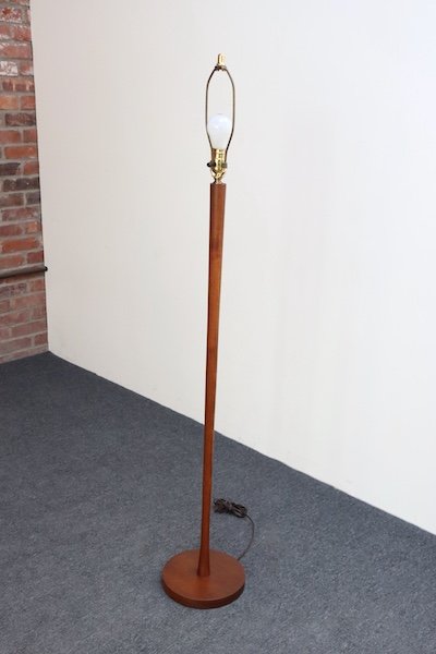 Simple, elegant floor lamp sculpted from solid teak with slender, cylindrical, tapered stem supported by dense round base (ca. 1960s, Denmark).