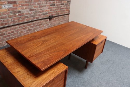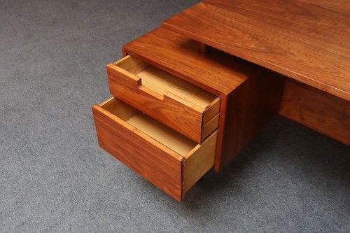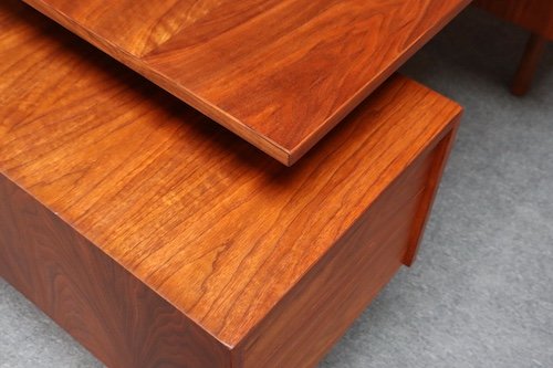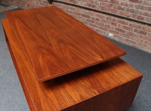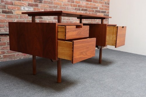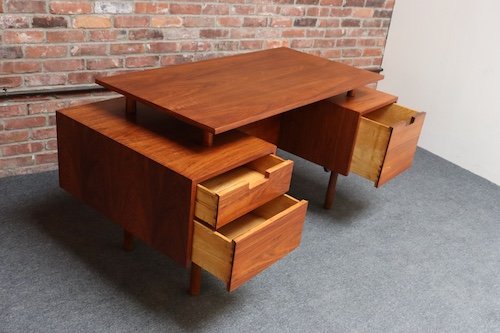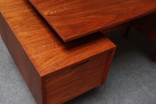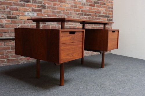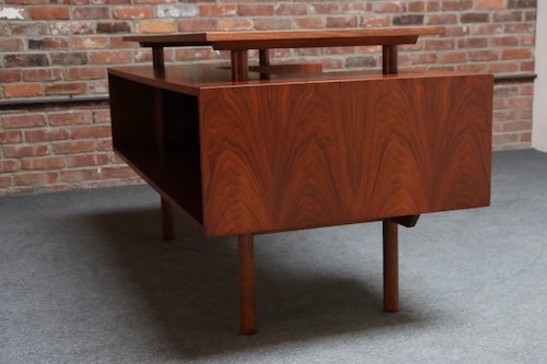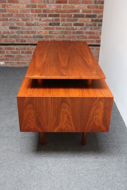 Walnut floating top desk supported by cylindrical feet, model 1625 designed by Milo Baughman for Glenn of California (ca. 1955, USA).