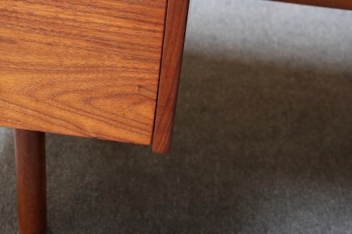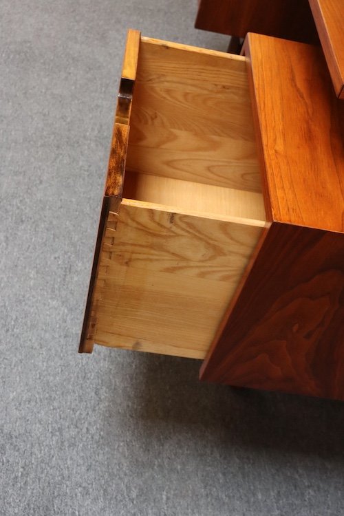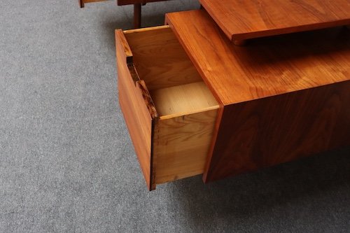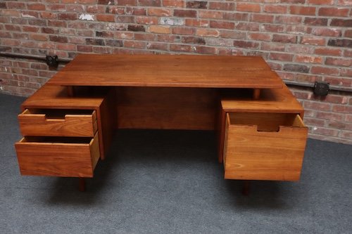 Thoughtfully designed to optimize space and storage — the desk is double sided having three dovetailed drawers with deeply carved, recessed pulls on one side and an open bookshelf back for additional storage. Further, the floating surface is not only visually appealing, but also allows the secondary surface to be used for storage.