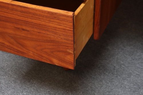 Newly refinished condition; only light wear remains, as shown, along with a few small veneer repairs to the left drawer fronts.