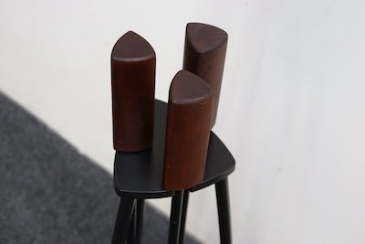 Geometric design elements present – bent iron rod frame connecting a guitar pick-form base and corresponding cradle with tools boasting dense, triangular, walnut handles.
