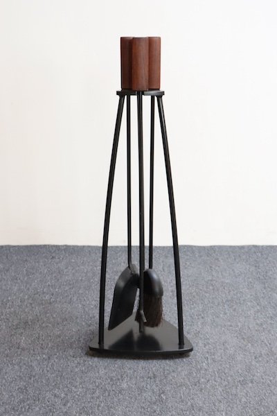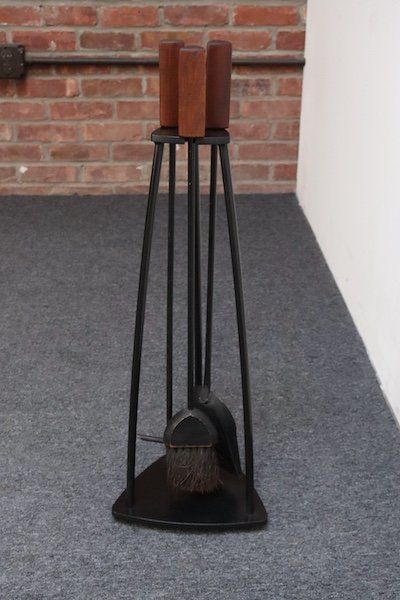 Hand forged iron fire tool set including holder, shovel, brush, and poker (ca. 1960s, USA).