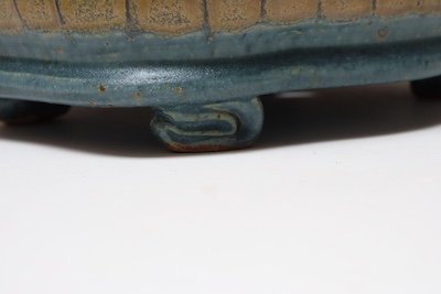 This piece dates to the early 1990s, based on the signature “D. Nichols,” which she used during that era and features a unique, oblong shaped vessel in blue and ochre with a striated pattern. Supported by four block-form feet. Attractive color palette, sculptural form, and incised linear decoration.