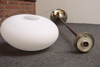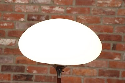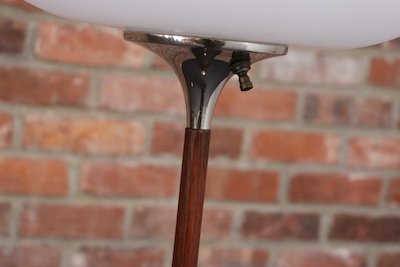 Composed of a walnut stems supporting frosted glass mushroom-form shades with sculptural chrome accents (base and neck).