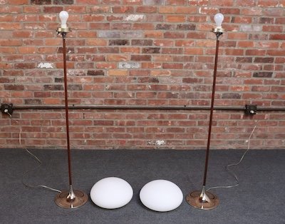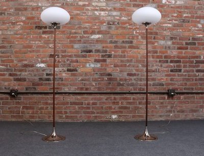 Pair of Chrome Laurel Floor Lamps with Frosted Mushroom Shades and Walnut Stems