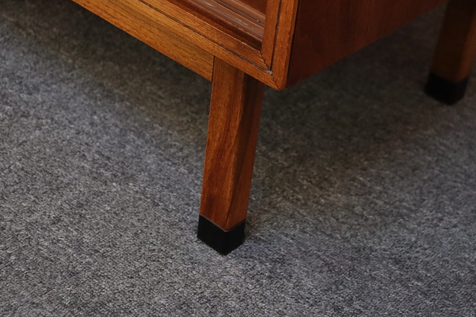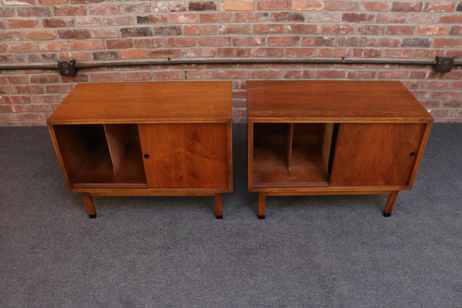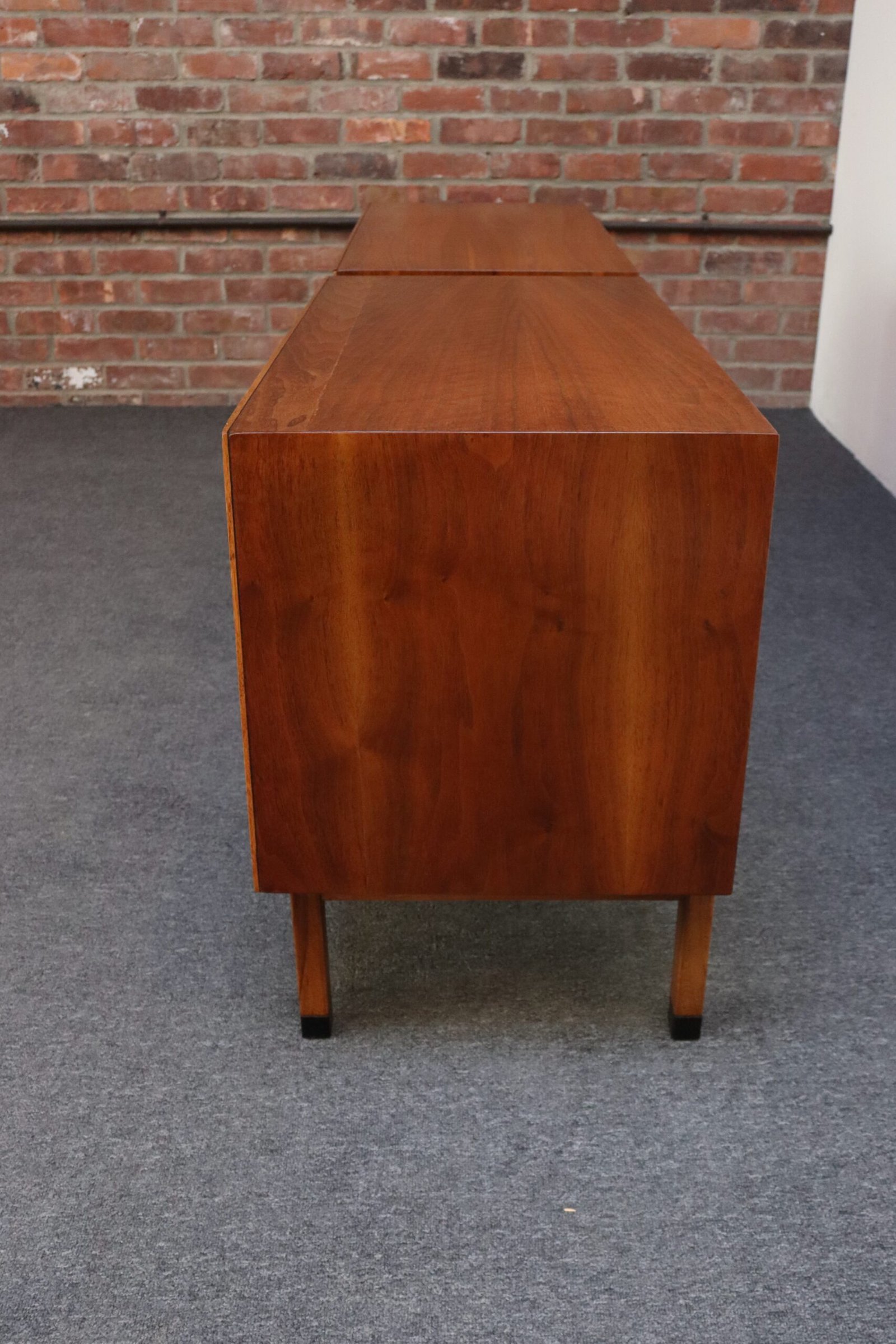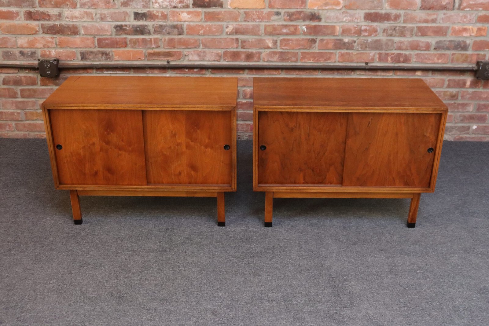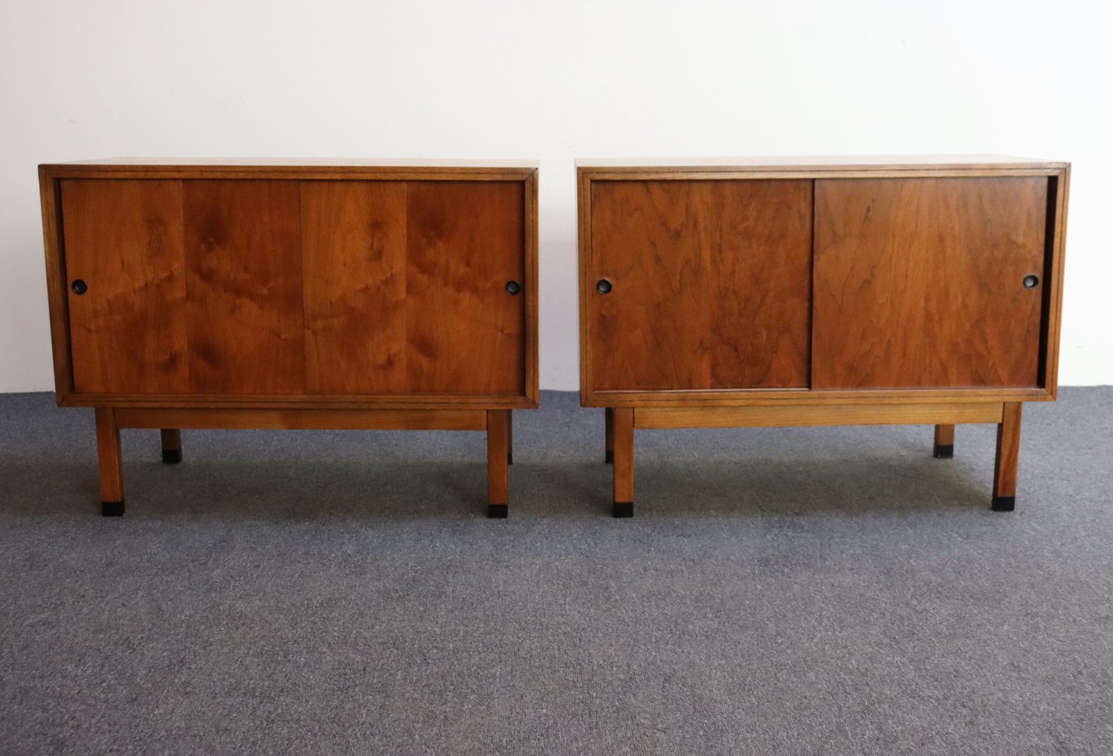 Stylish, practical pieces in newly refinished condition (black paint is original; walnut has been refinished). Light wear remains, as shown, namely one line of finish to one of the cabinet’s surfaces, along with minor scuffs.