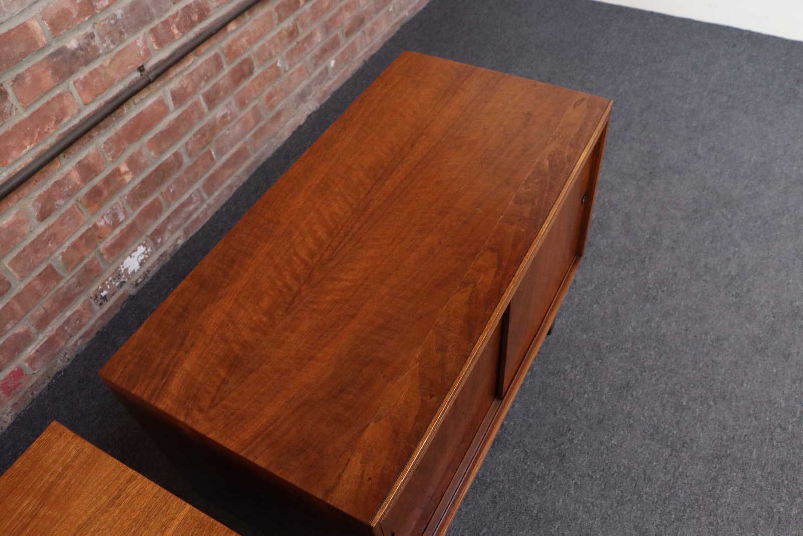 Pair of Mid-Century Modern walnut record cabinets by Lane (ca. 1960s, USA).