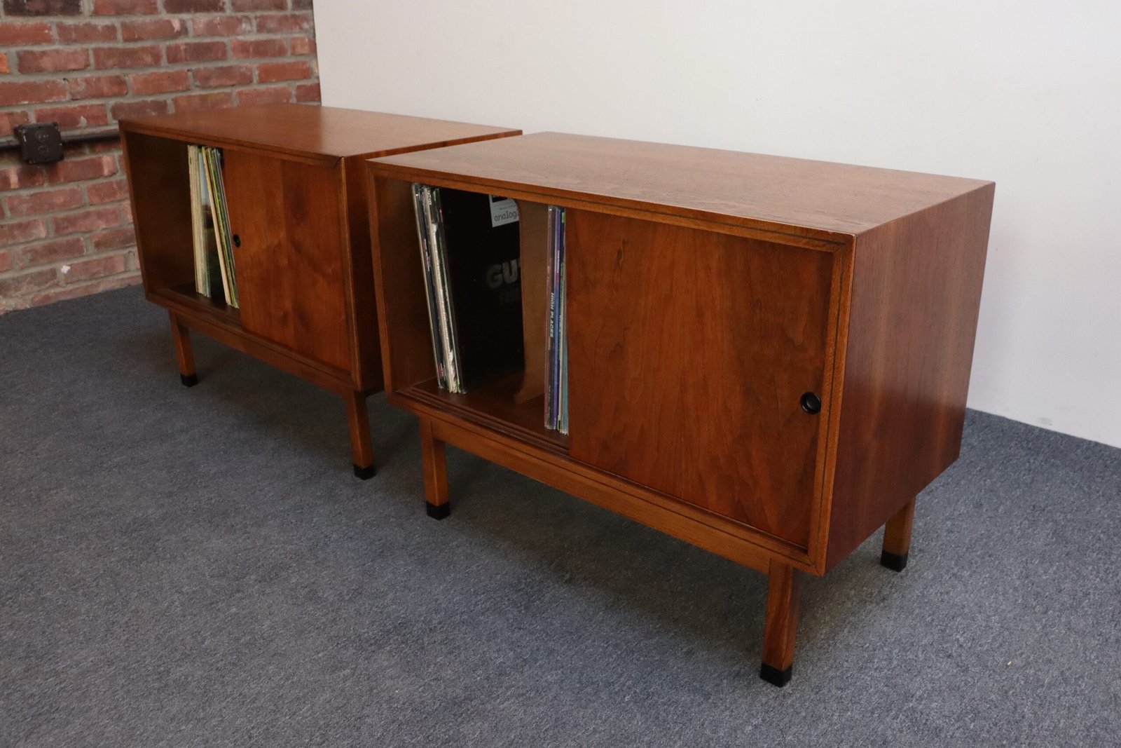 Composed of sliding doors with black recessed metal pulls and corresponding black feet opening to reveal two fixed LP dividers/side (four dividers/cabinet).