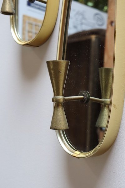 Very good, vintage condition – unpolished brass candle holders display rich patina/tarnish and aluminum frames only show a couple of spots of wear, as pictured.