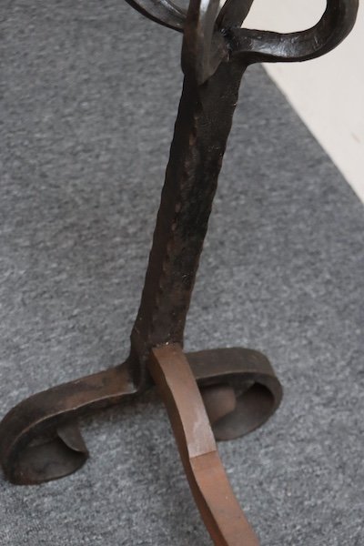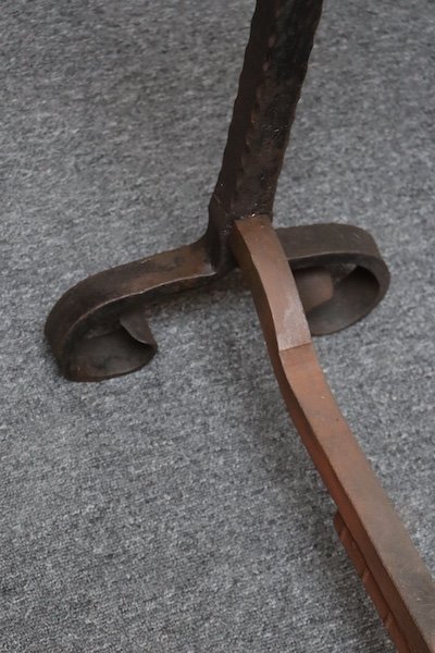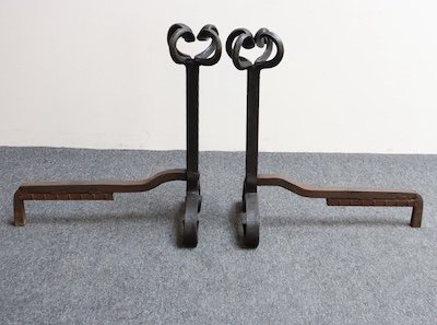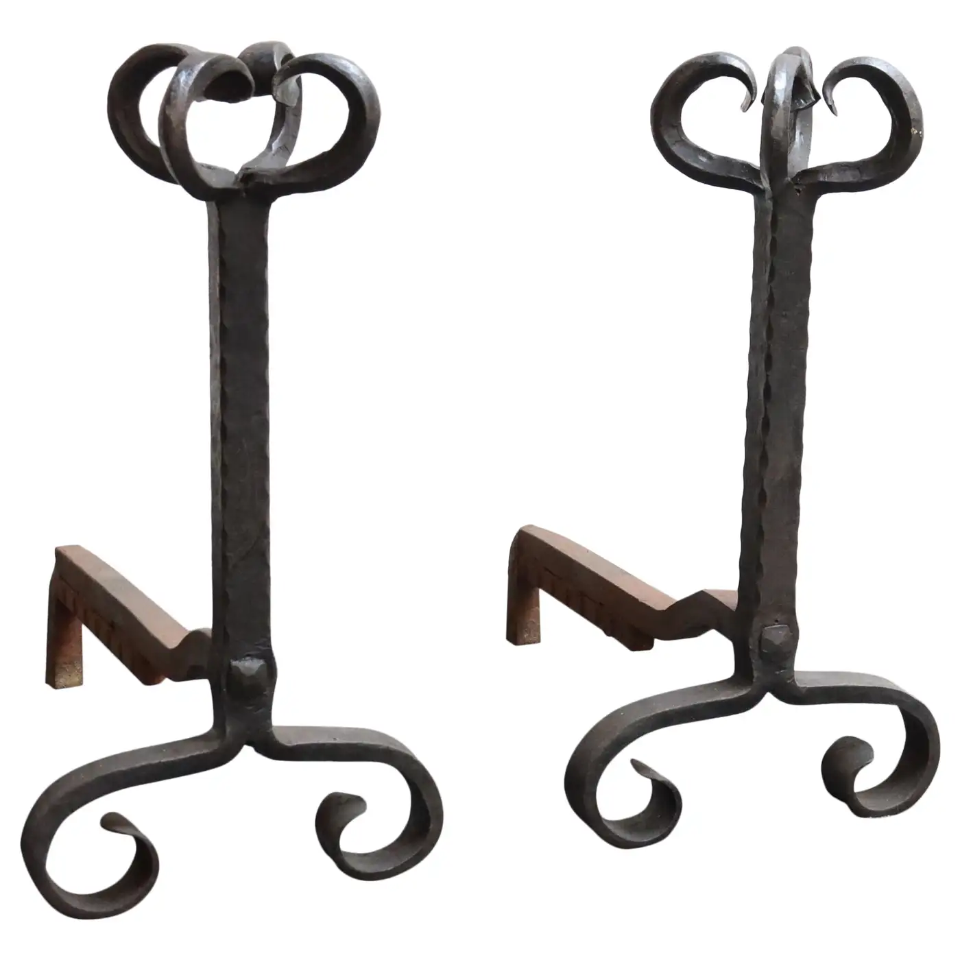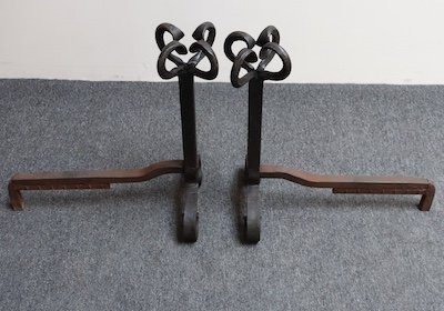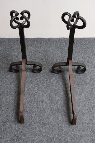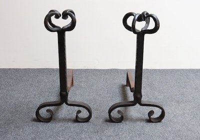 Arts & Crafts-era andirons composed of scroll-clusters atop slender hammered uprights attached to iron billet bars (ca. mid-19th Century, USA).