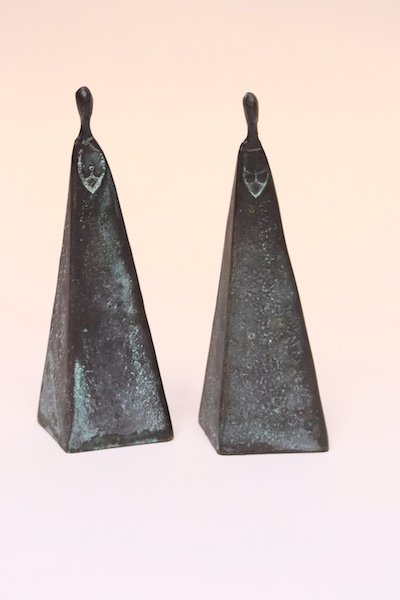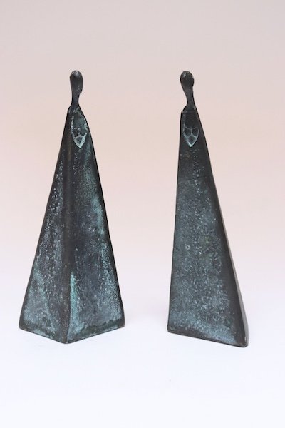 Set of two petite Brutalist patinated bronze geometric-form abstract female figural sculptures (ca. 1960s).