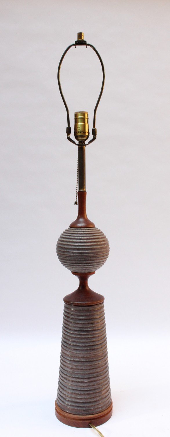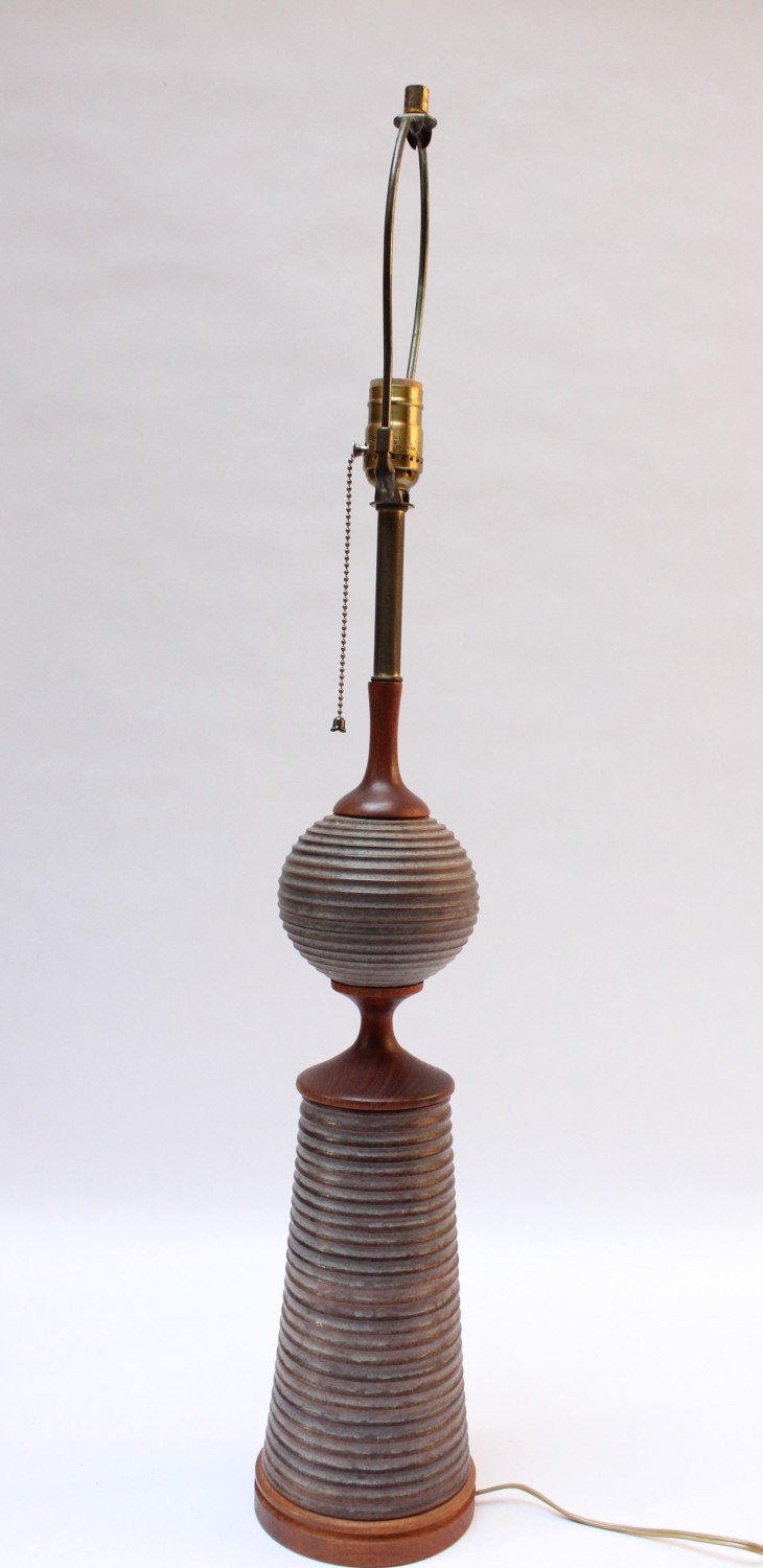Elegant ceramic table lamp (Scandinavia, ca 1960s) featuring a central ‘orb’ with linear pattern and corresponding base pattern bordered by solid, staved-teak accents.