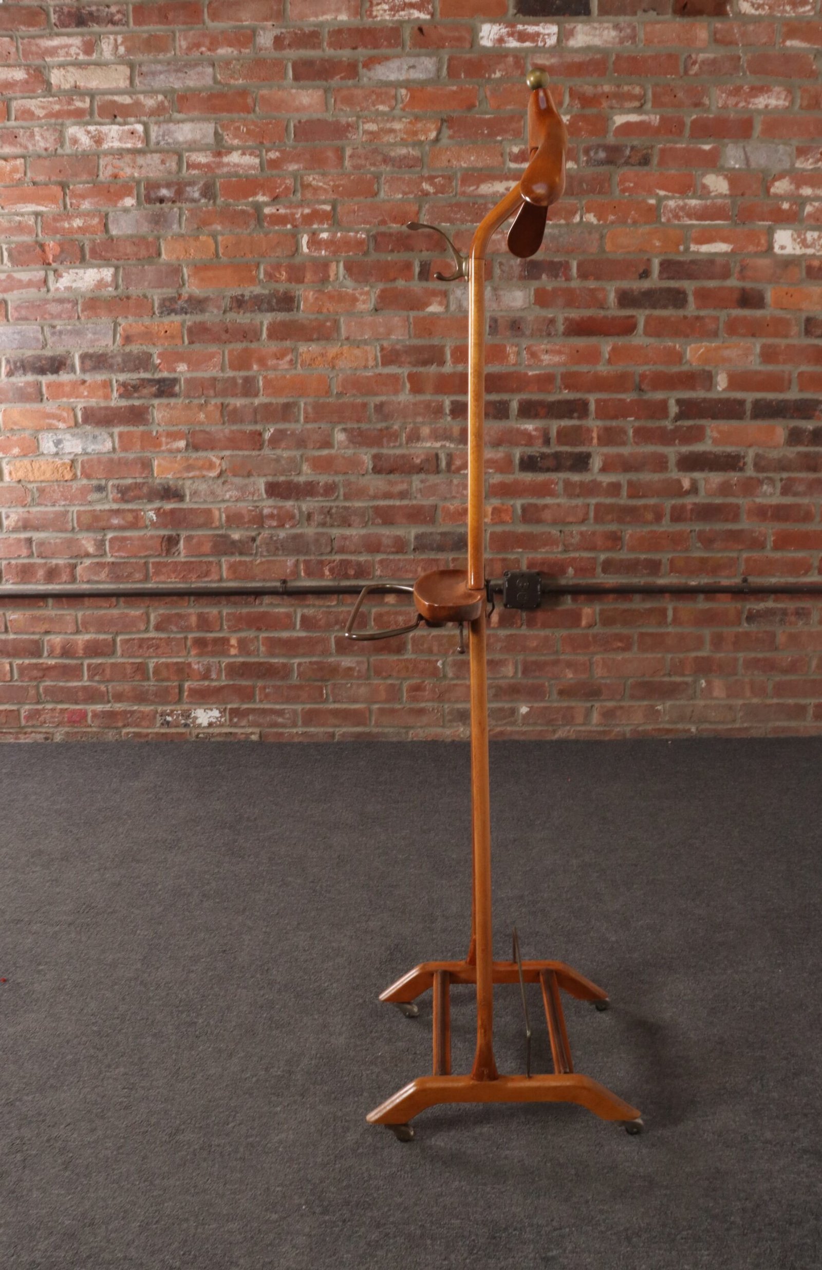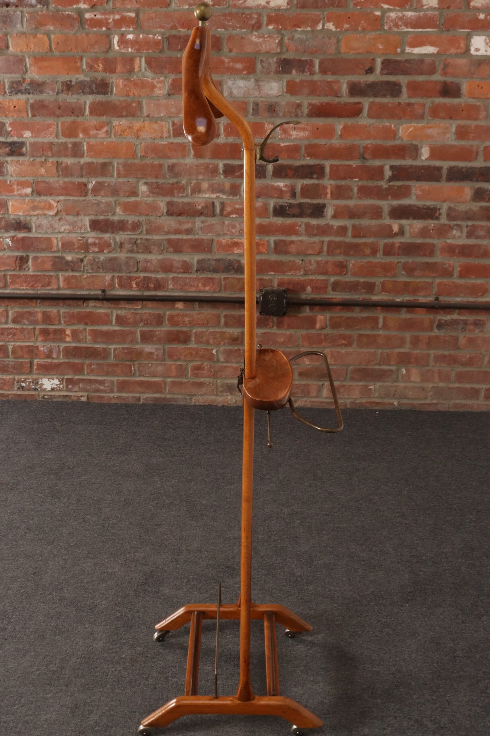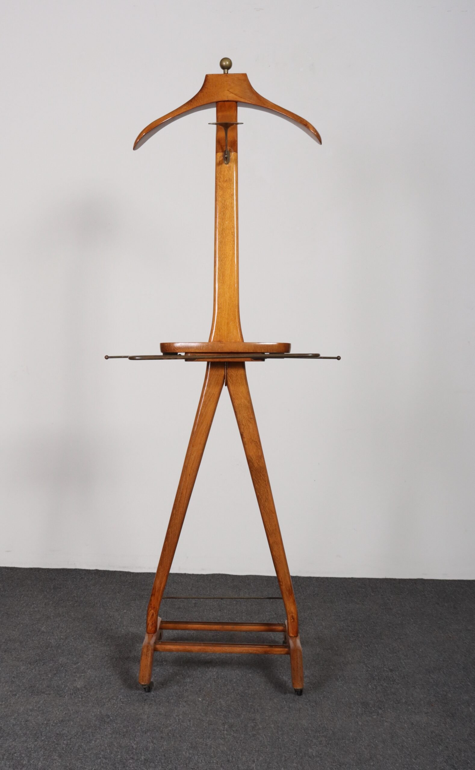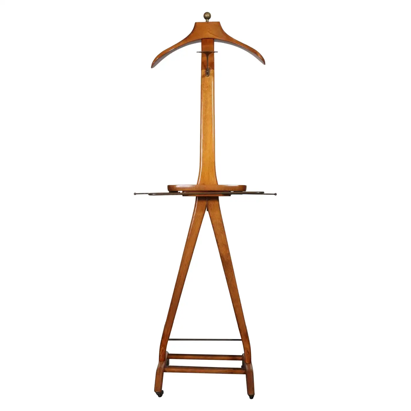 Composed of a sinuous beechwood frame with hanger surmounted by a brass ball finial and molded change/cufflink holder with a retractable top bar and brass wire rack (both intended for hanging scarves, ties, or pants), all supported by a trestle base with double rack for shoes and four caster wheels for easy mobility.