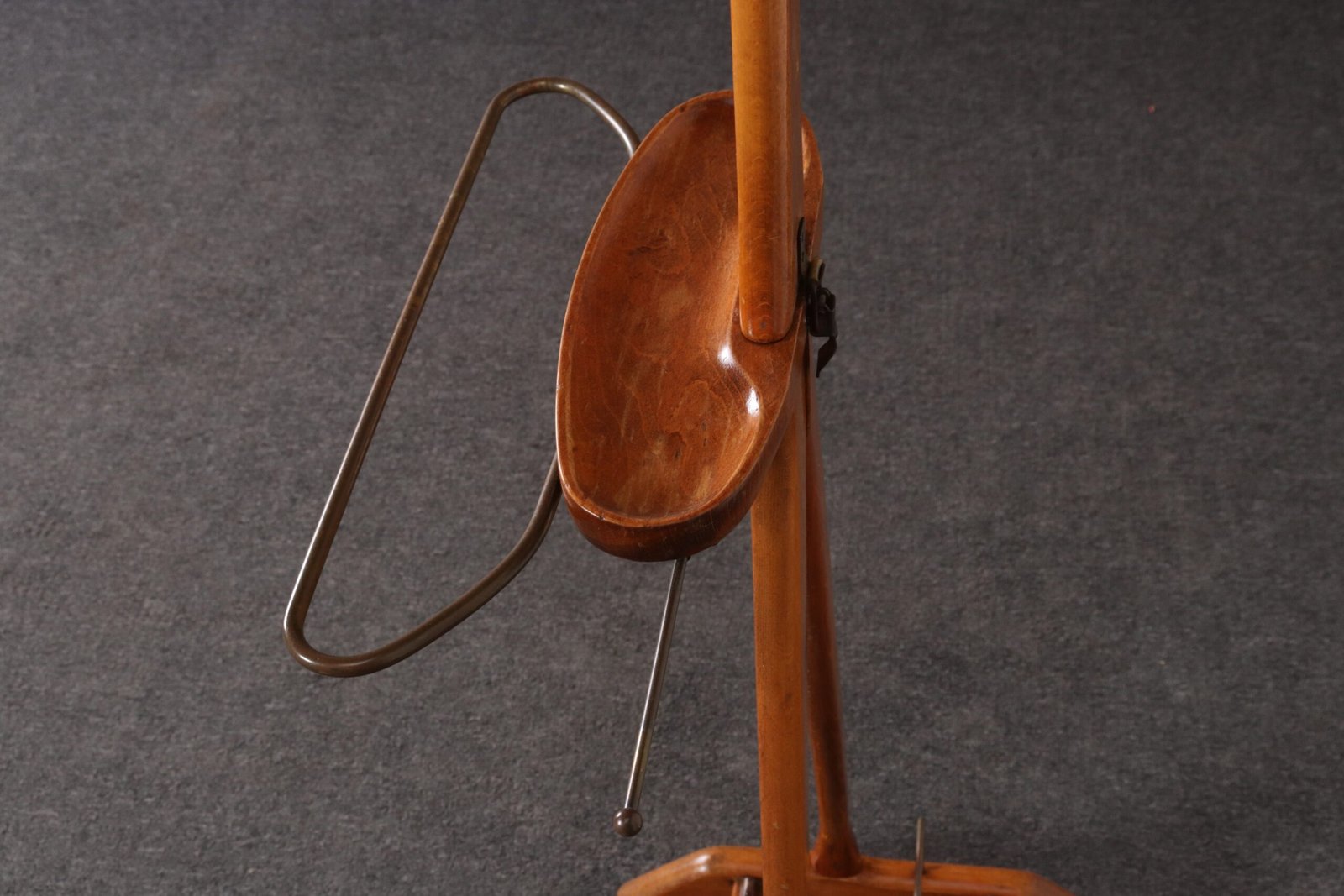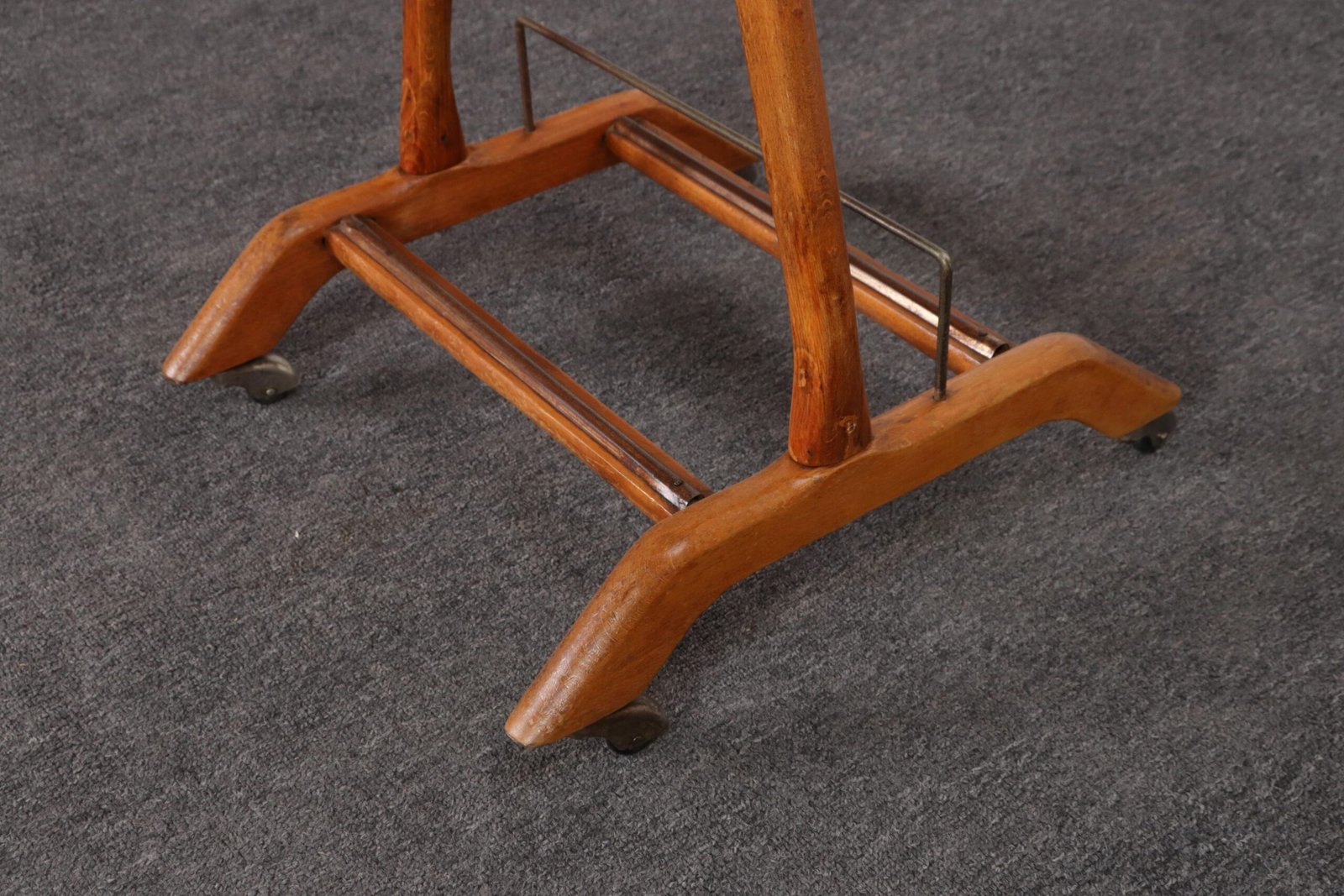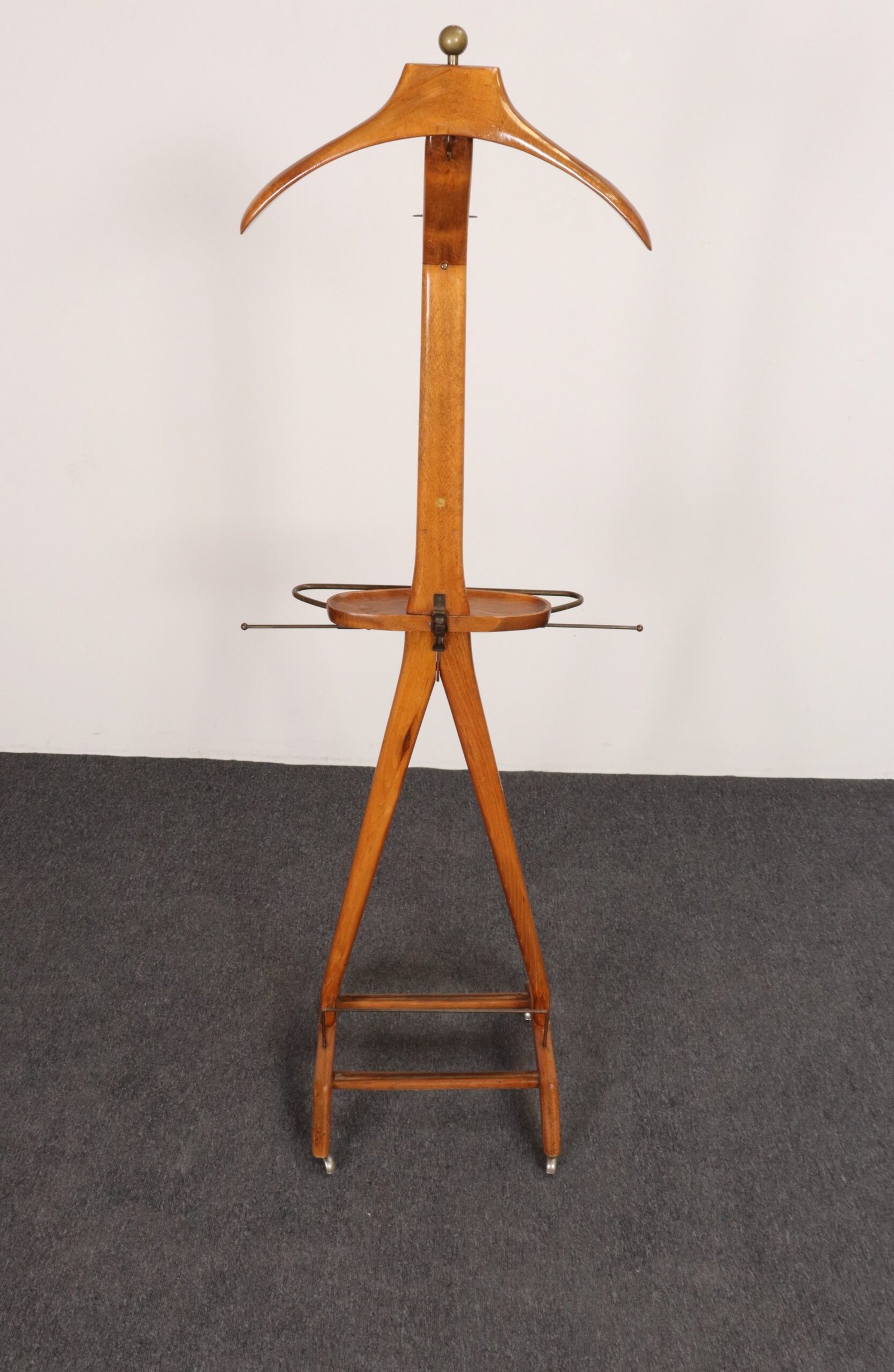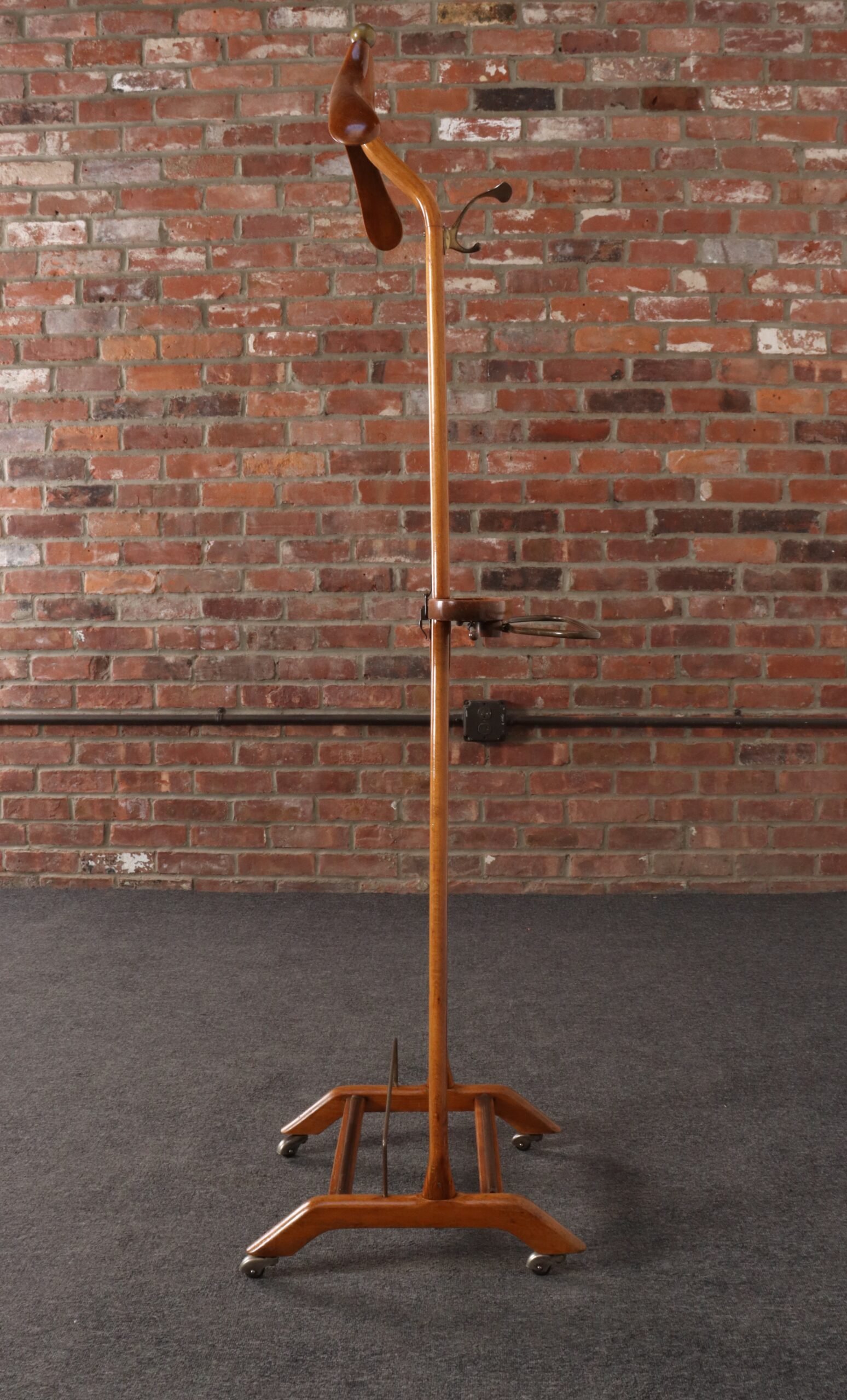 Composed of a sinuous beechwood frame with hanger surmounted by a brass ball finial and molded change/cufflink holder with a retractable top bar and brass wire rack (both intended for hanging scarves, ties, or pants), all supported by a trestle base with double rack for shoes and four caster wheels for easy mobility.