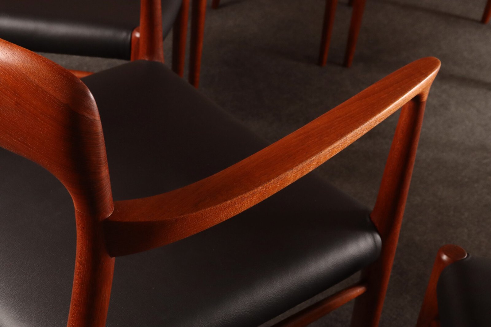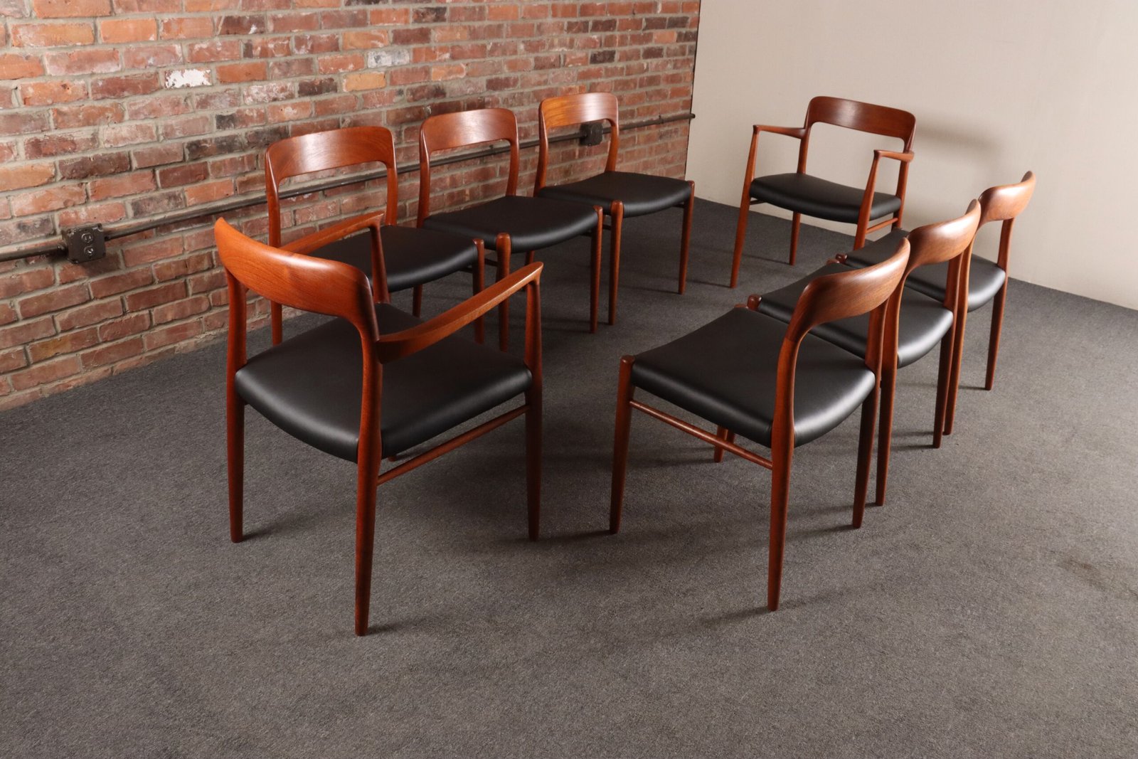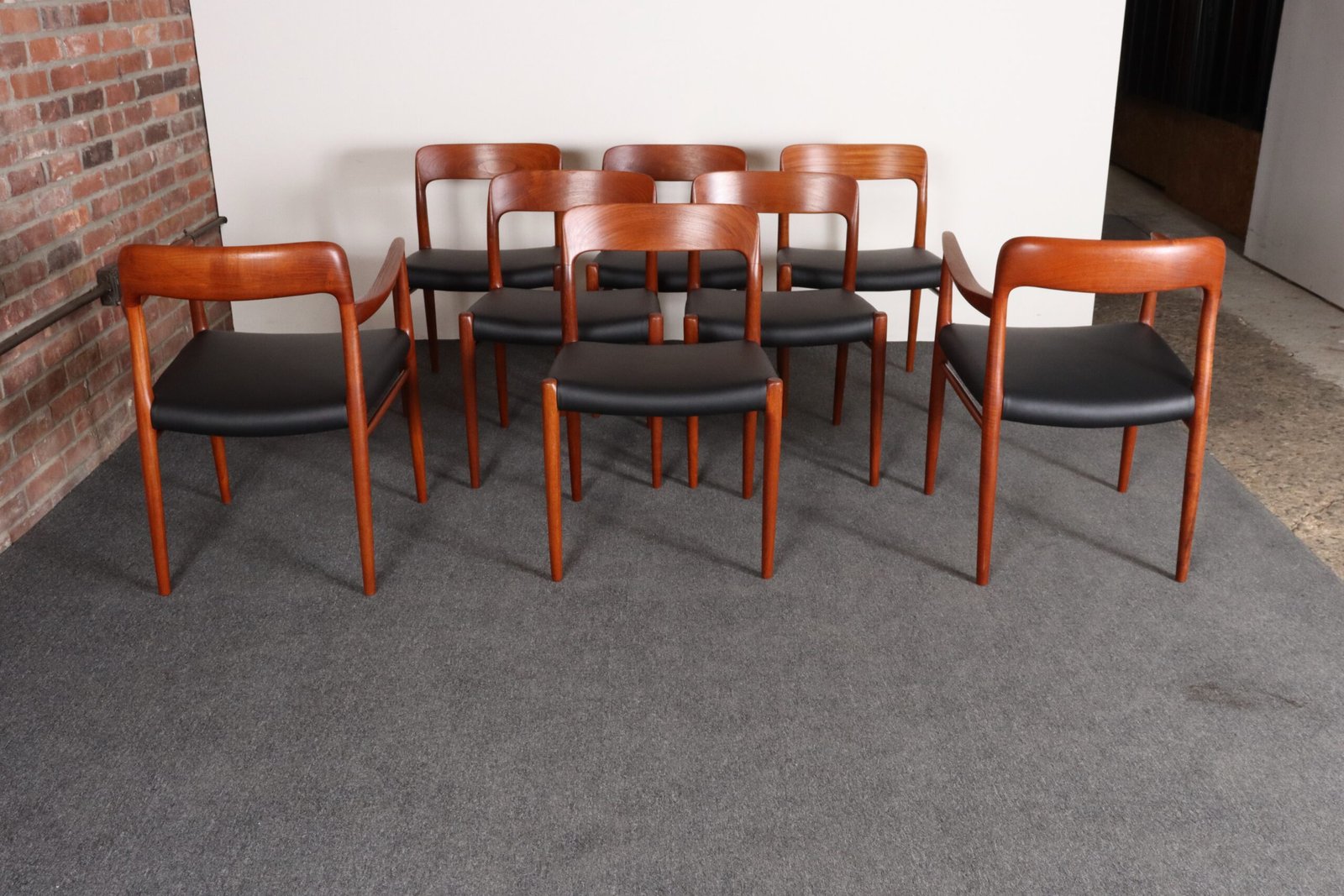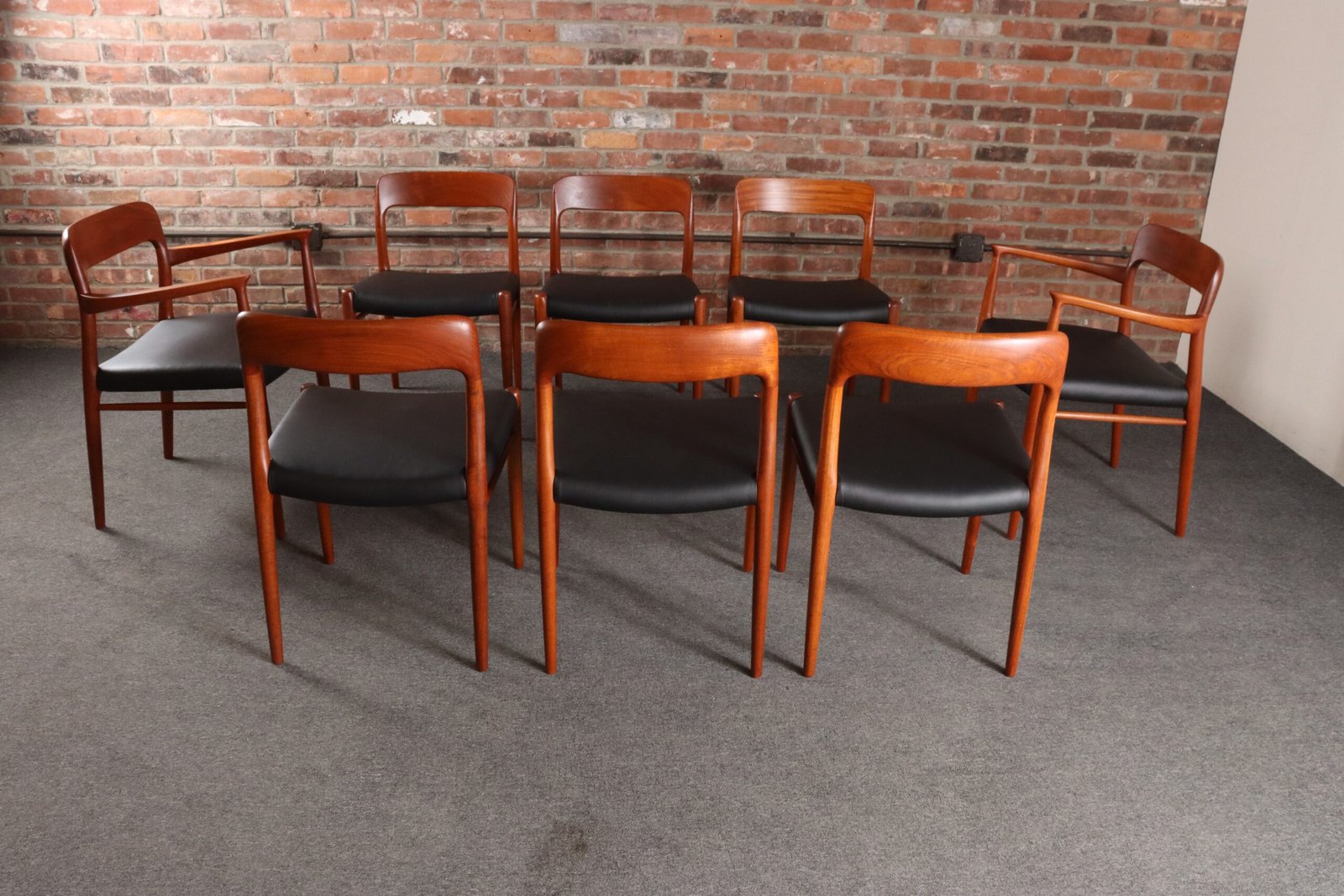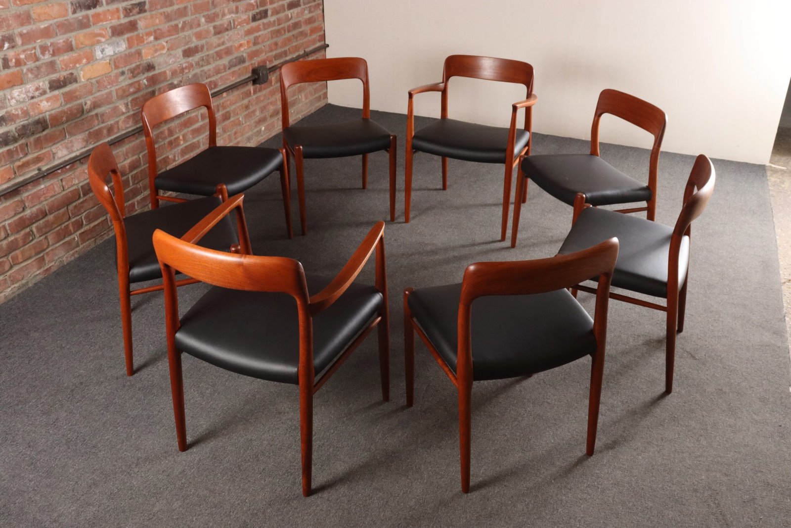 Set of eight dining chairs (two captains model #56 and six side model #75) in teak designed in the 1950s by Niels Ole Møller for J.L. Møllers Møbelfabrik of Denmark.